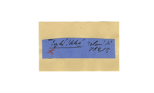 ink on blue paper glued on card