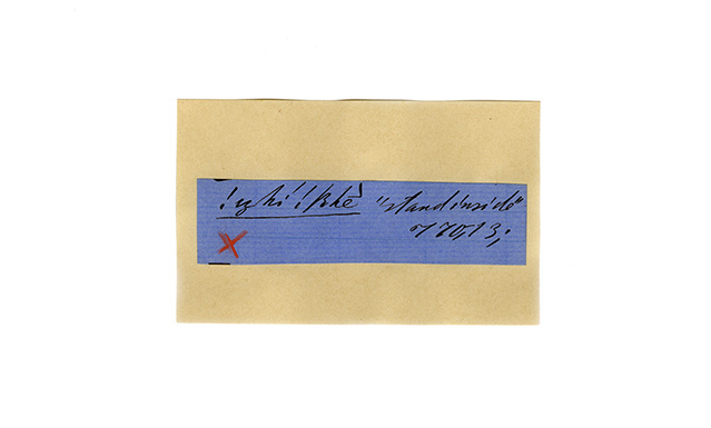 ink on blue paper glued on card