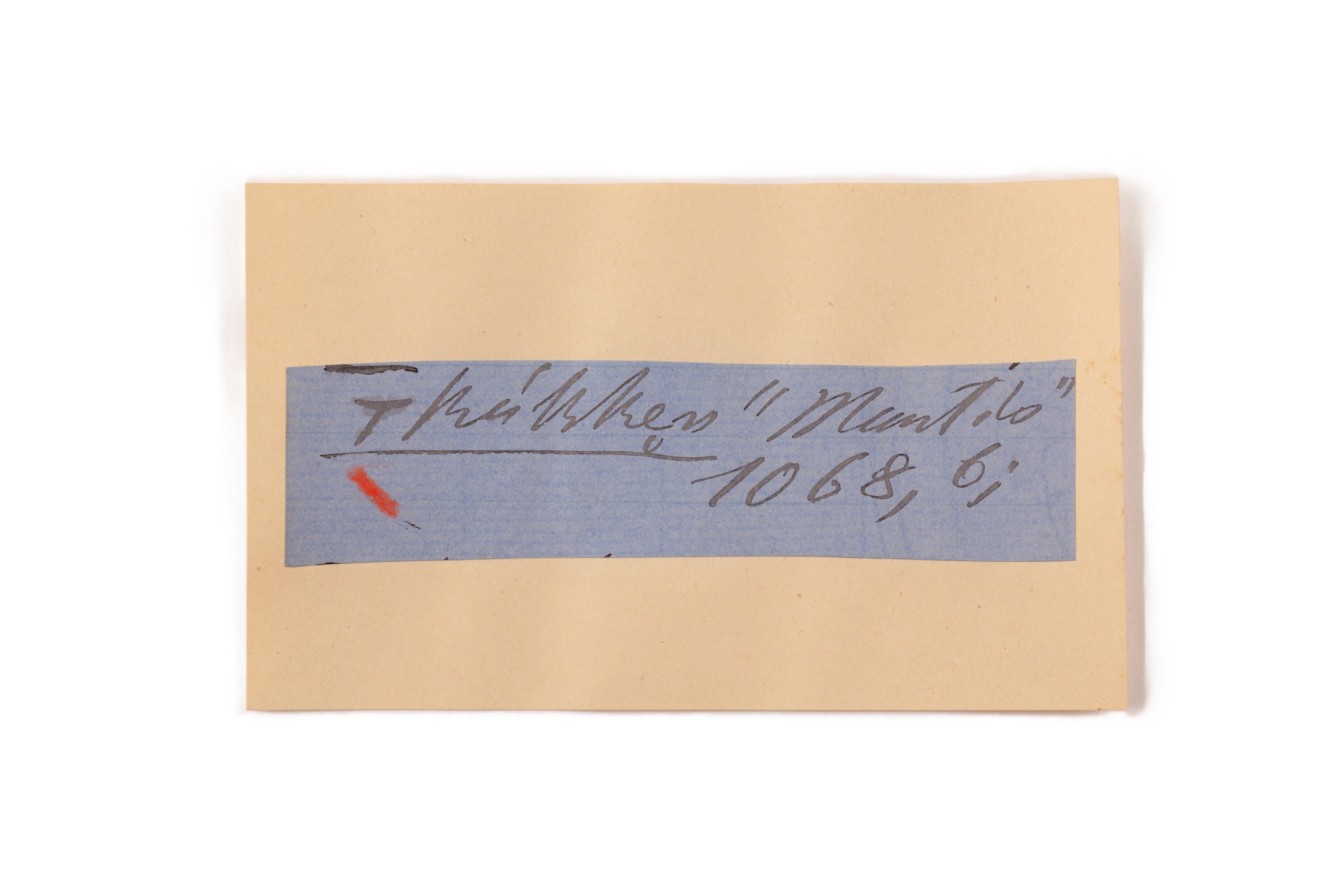 ink on blue paper glued on card