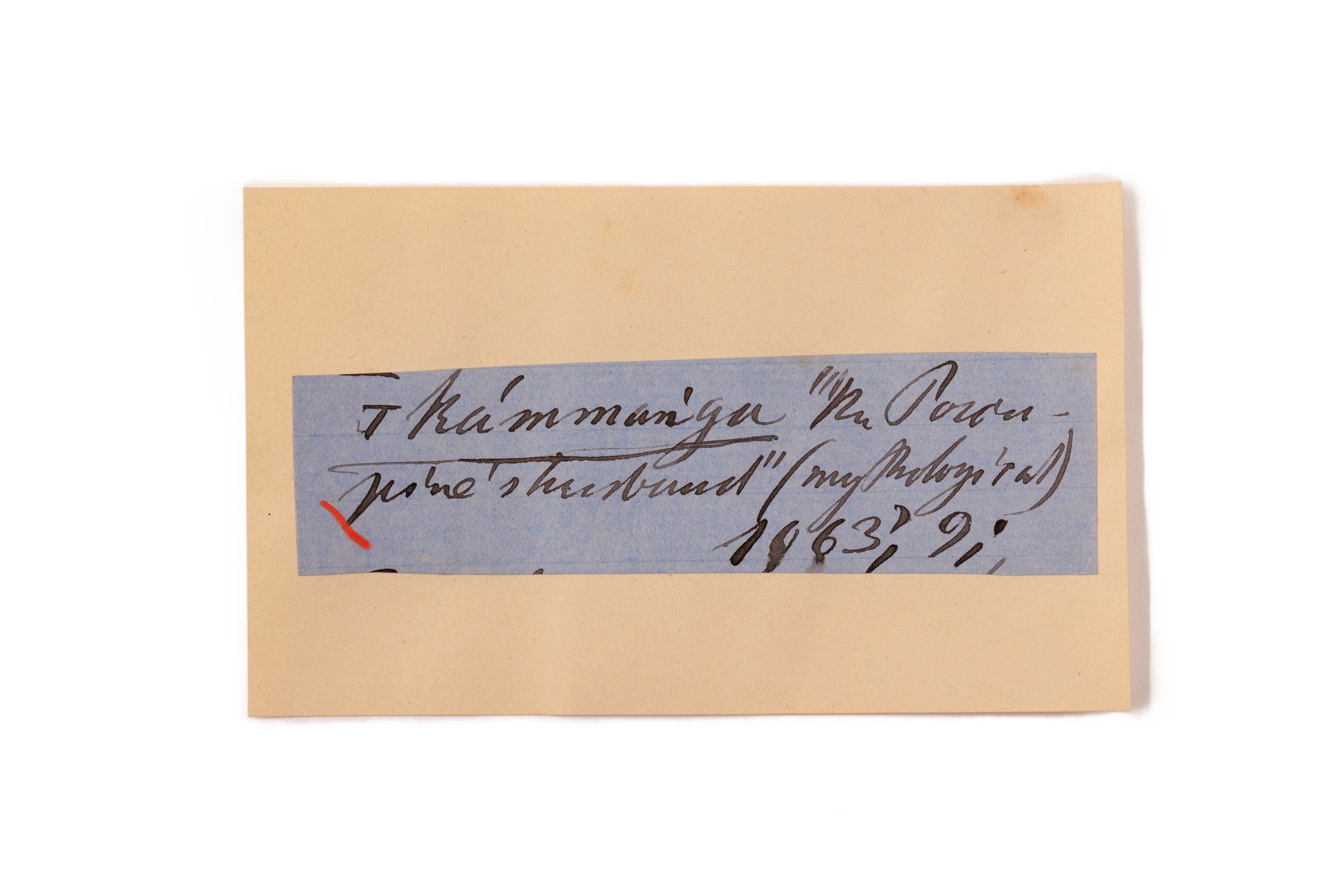 ink on blue paper glued on card