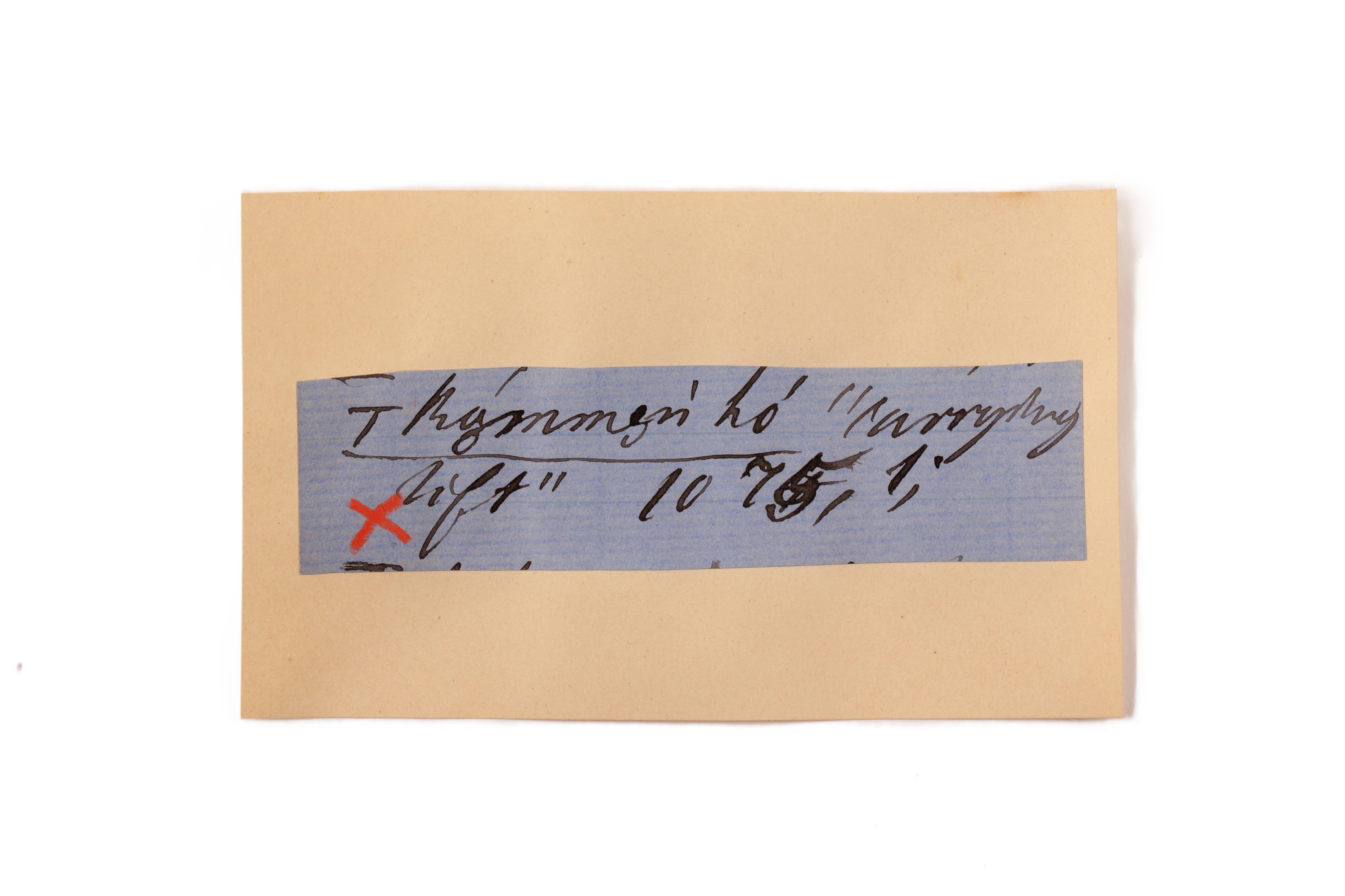 ink on blue paper glued on card