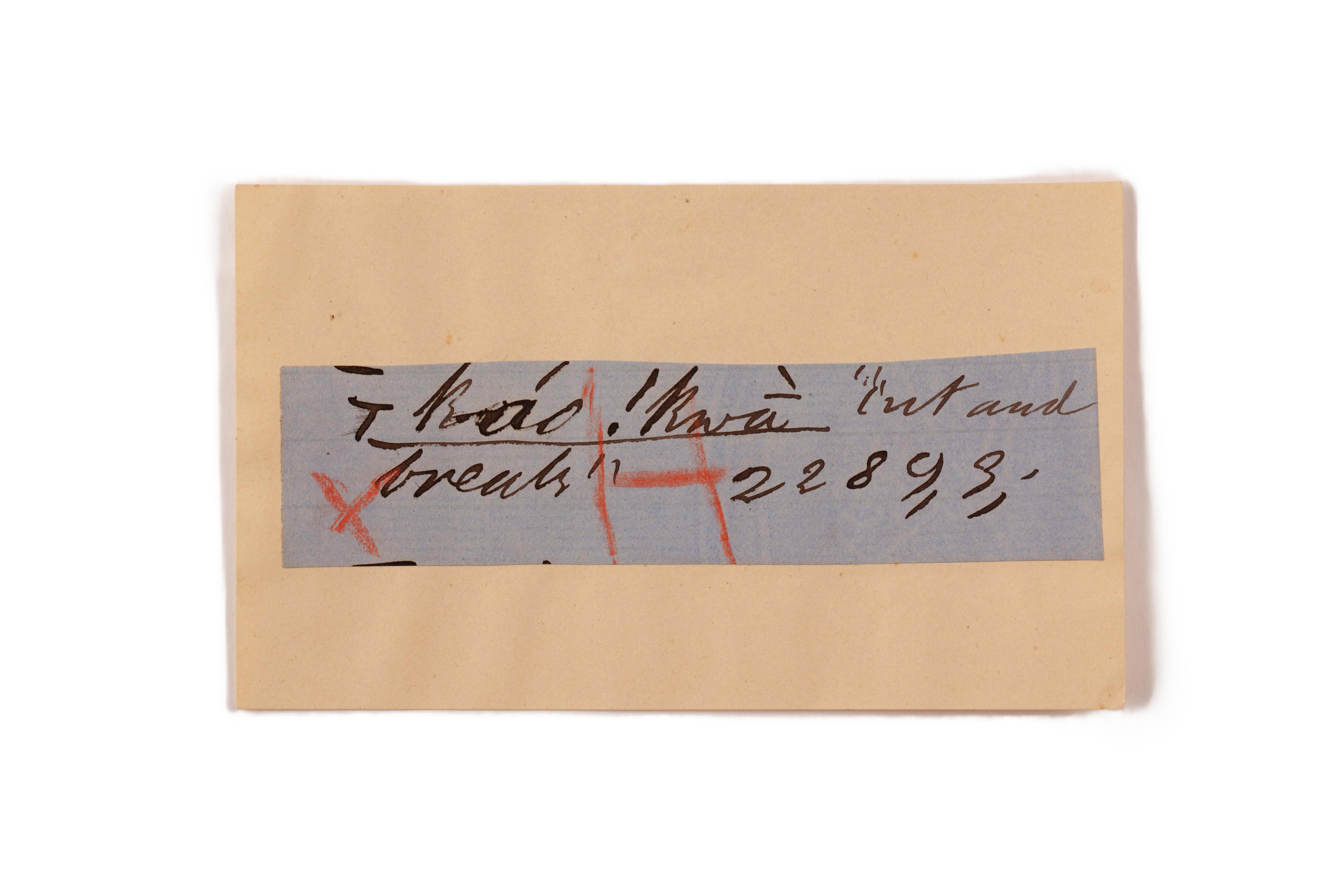 ink on blue paper glued on card