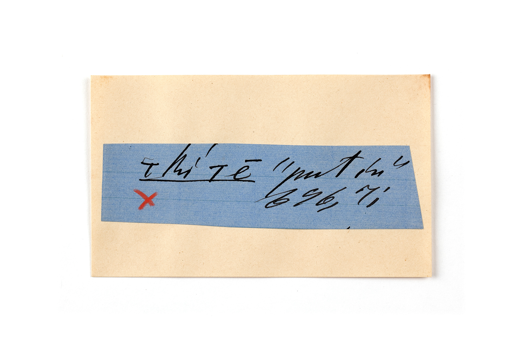 ink on blue paper glued on card