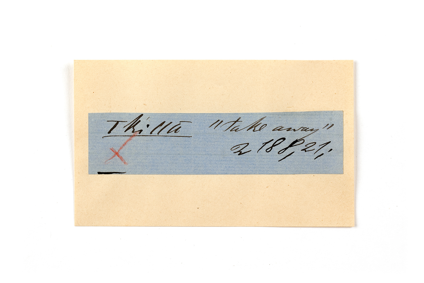ink on blue paper glued on card