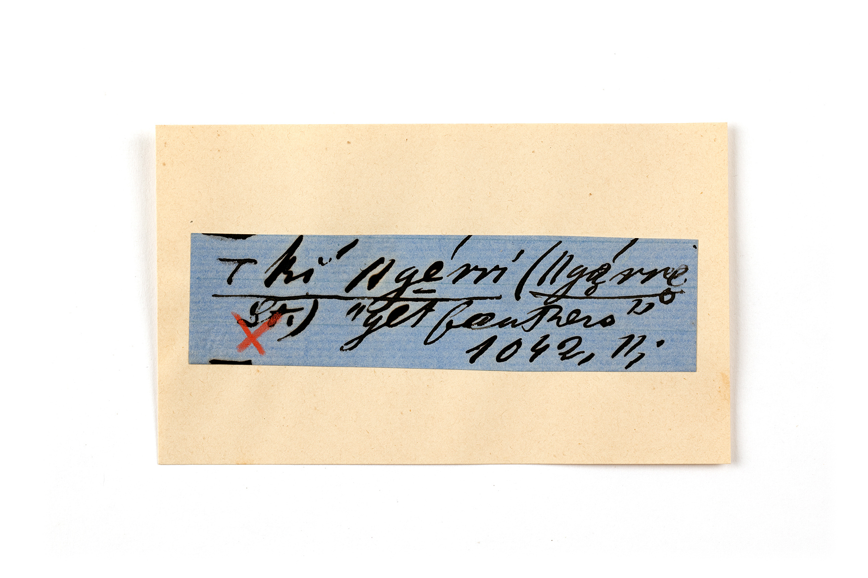 ink on blue paper glued on card