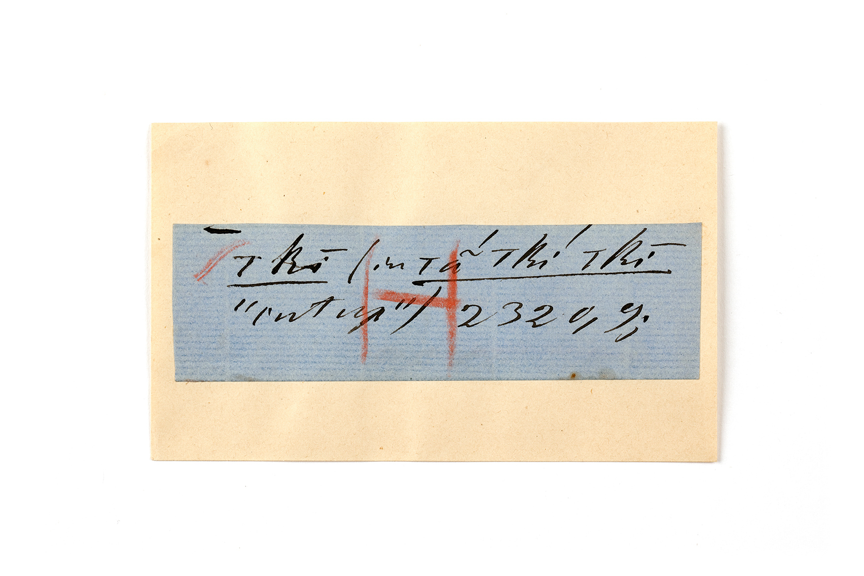 ink on blue paper glued on card