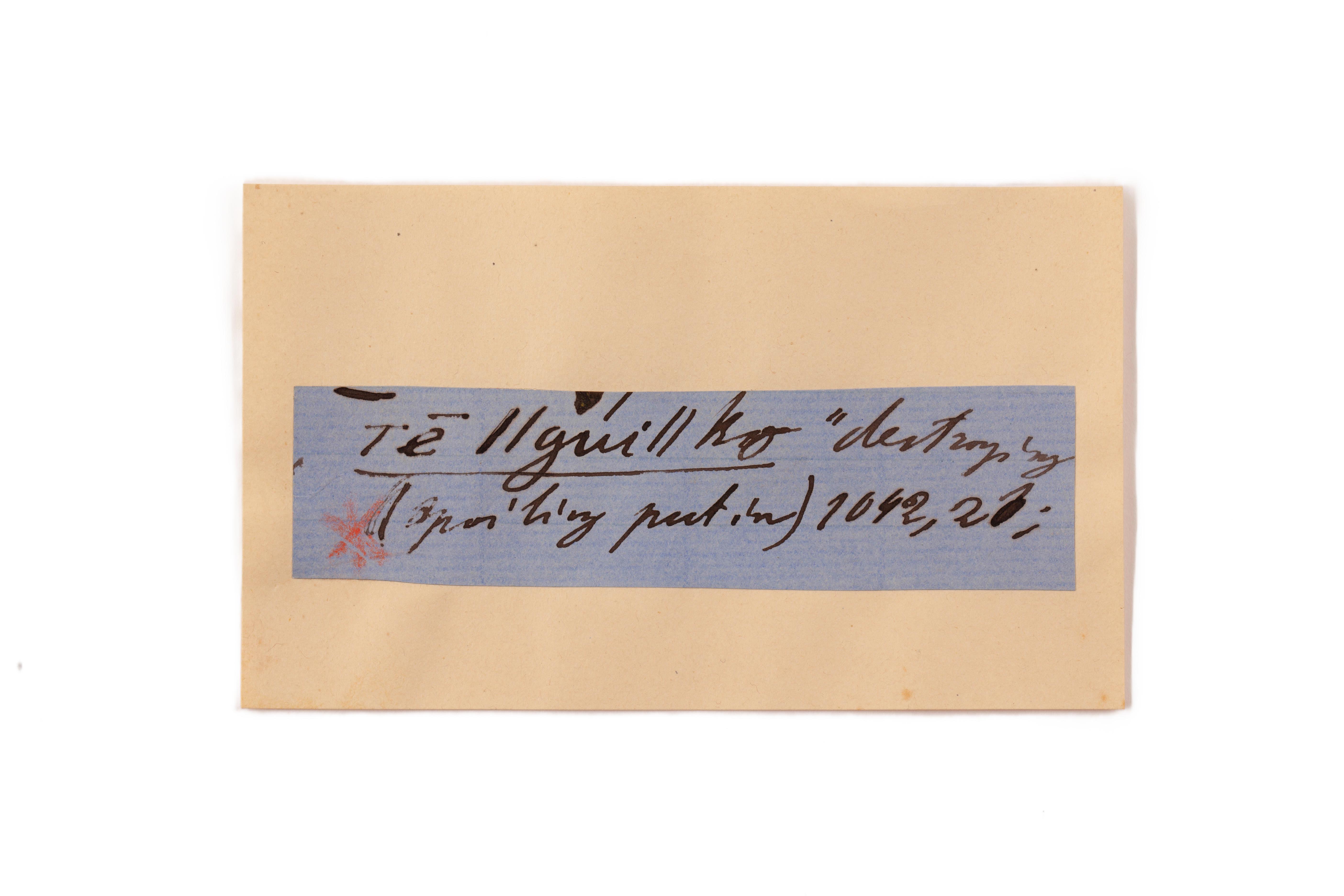 ink on blue paper glued on card