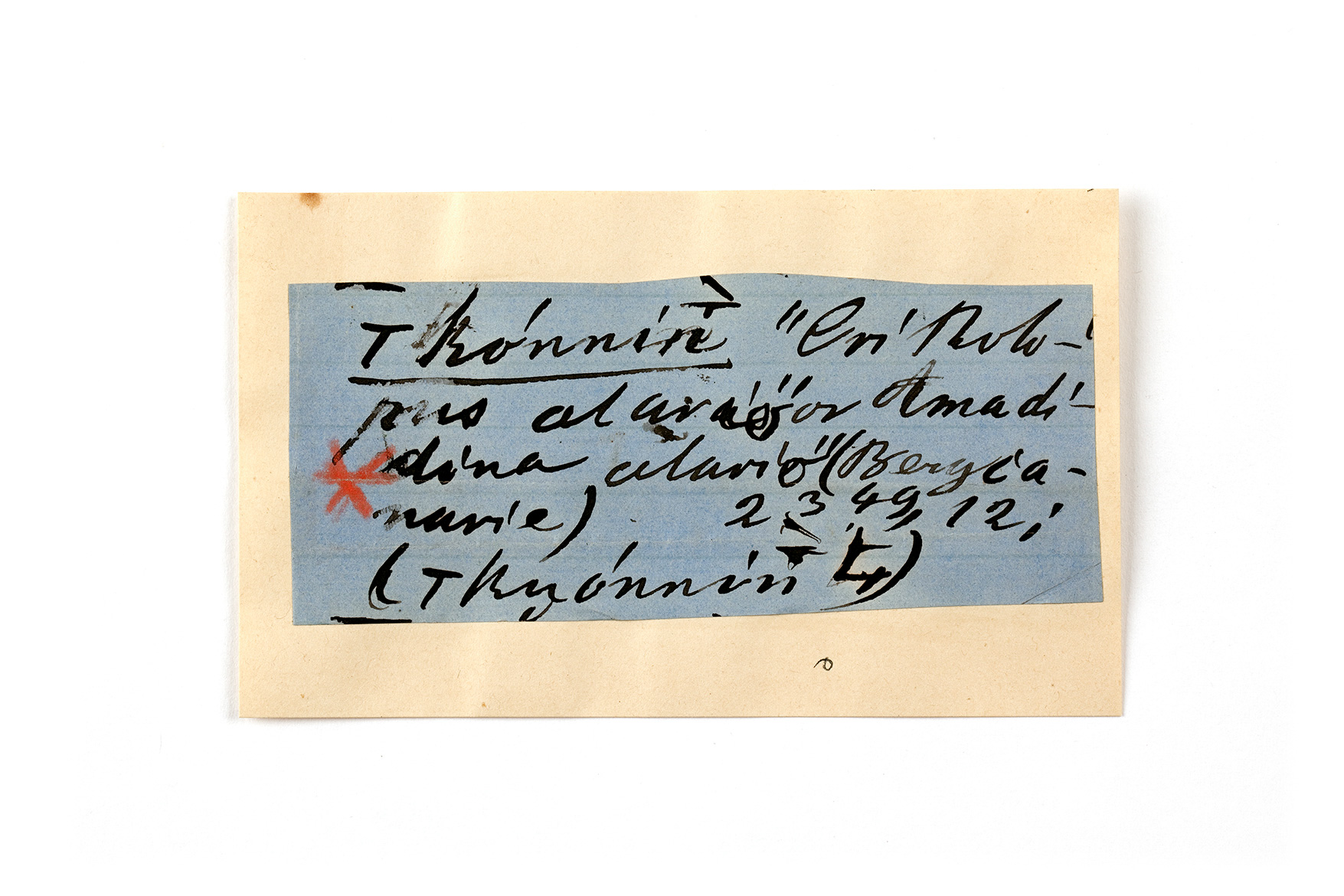 ink on blue paper glued on card