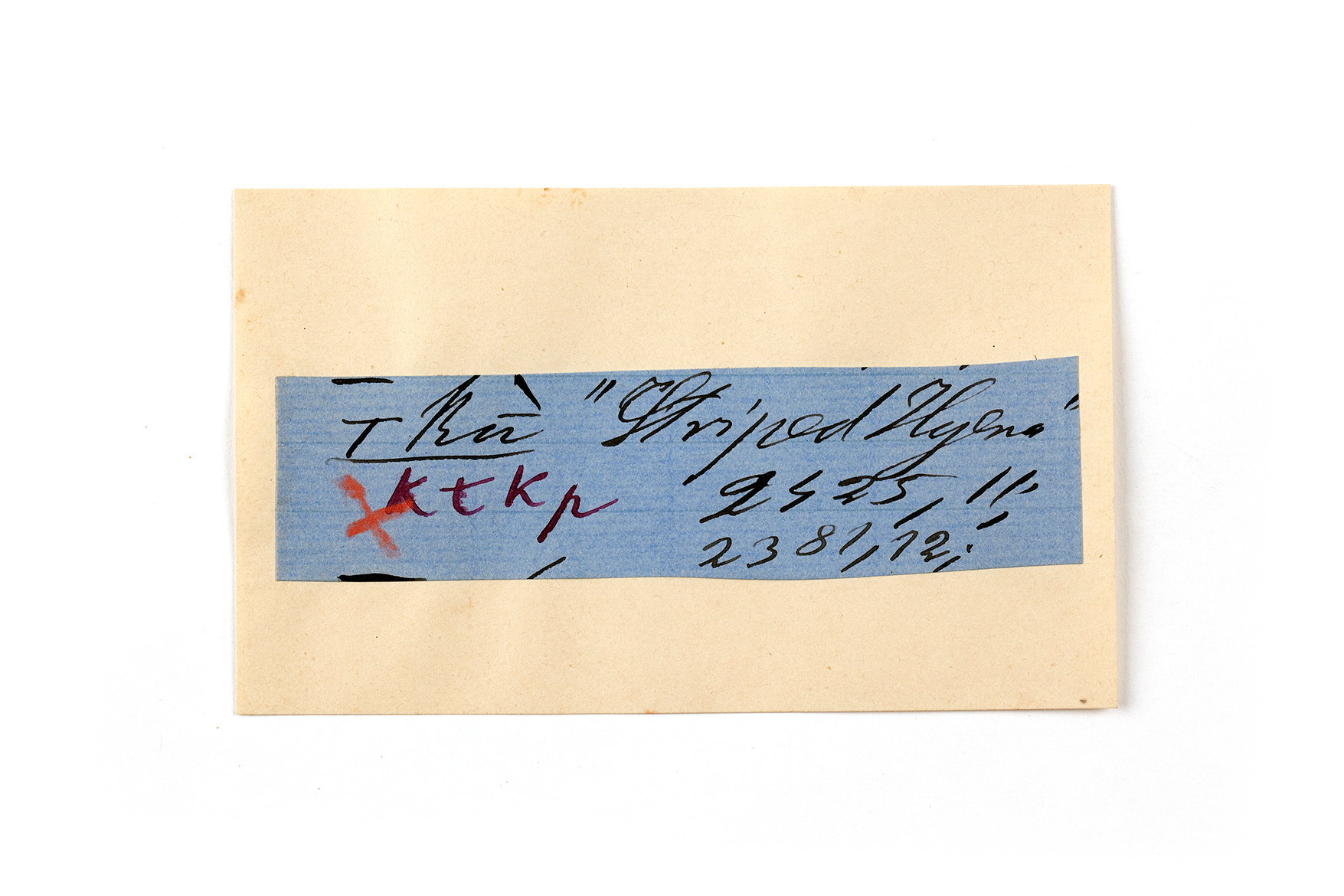ink on blue paper glued on card