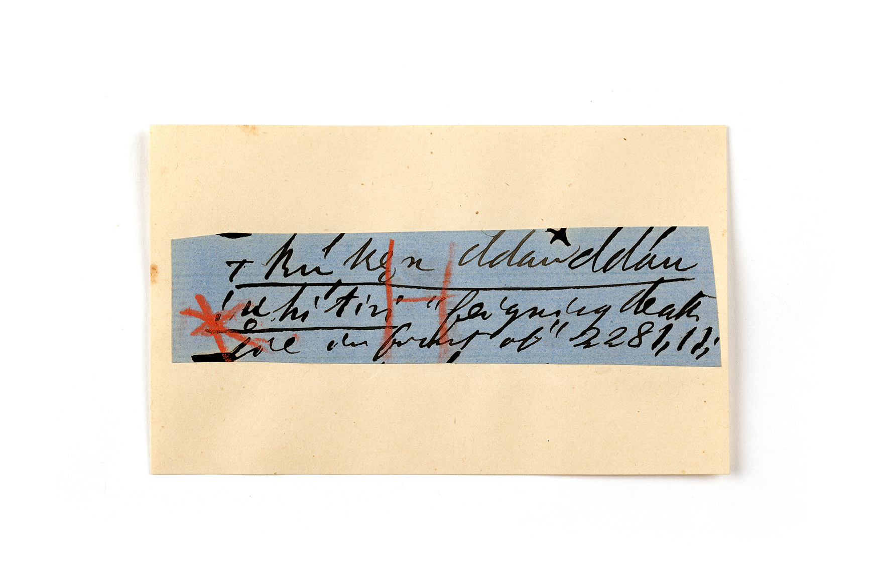 ink on blue paper glued on card
