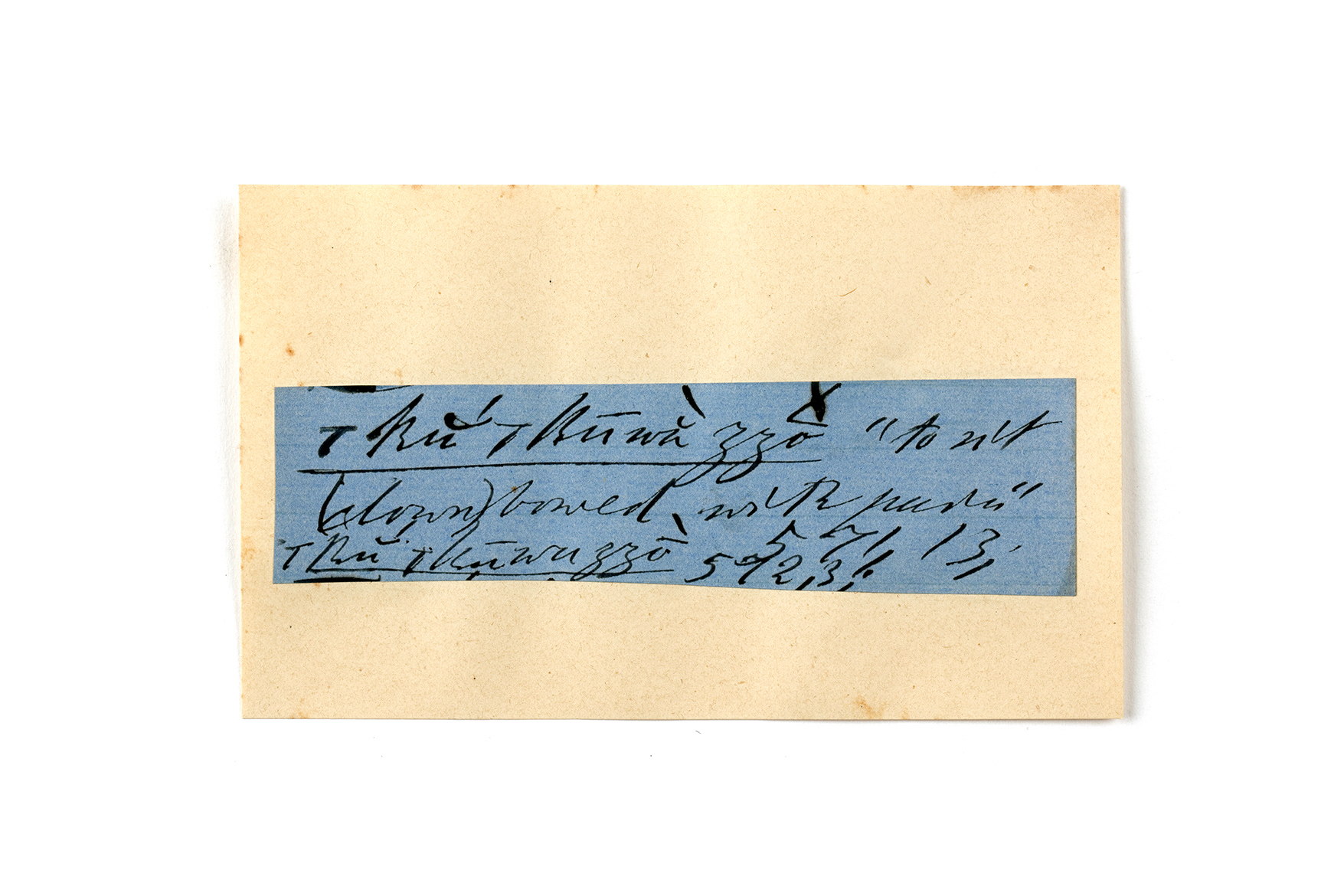 ink on blue paper glued on card
