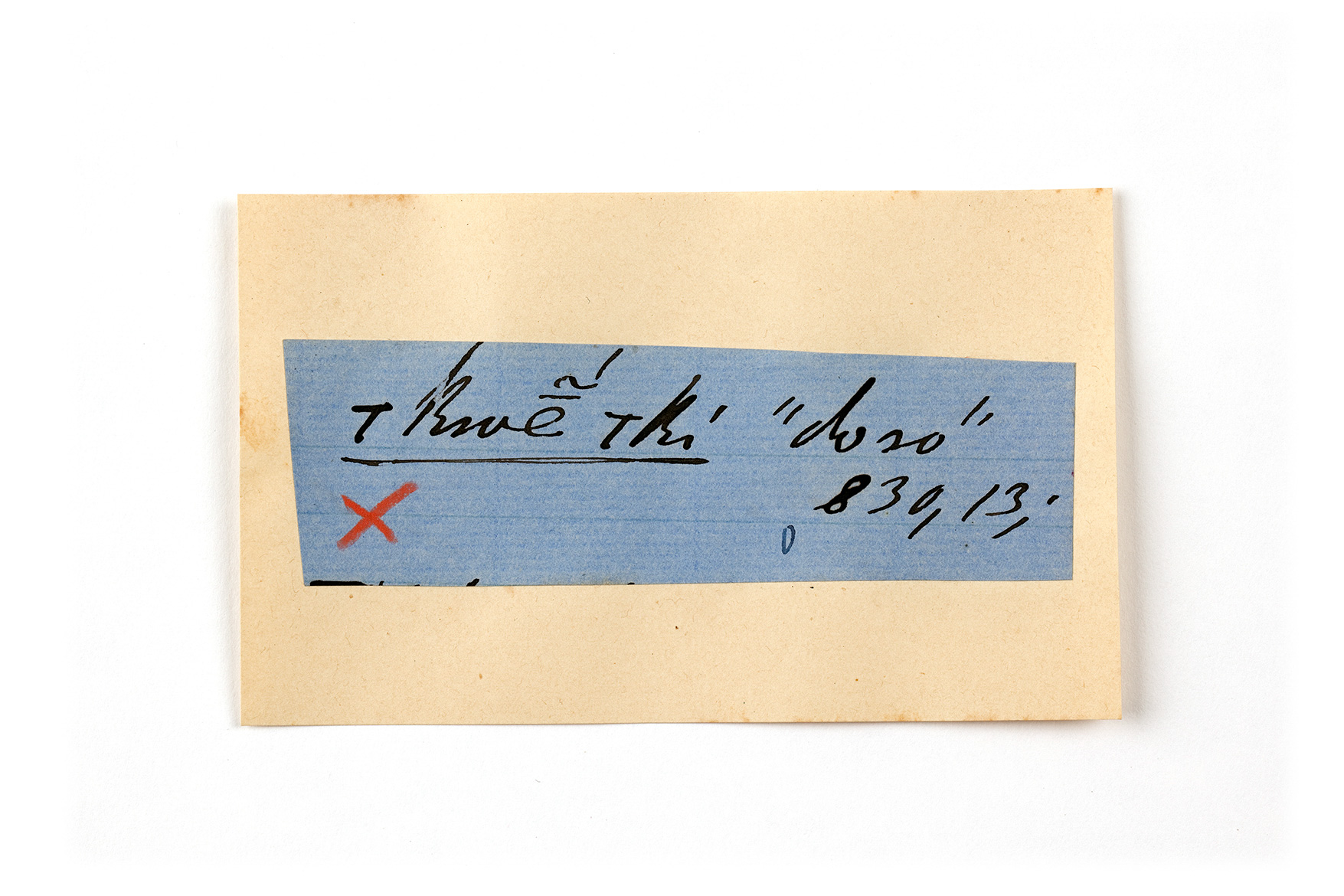 ink on blue paper glued on card