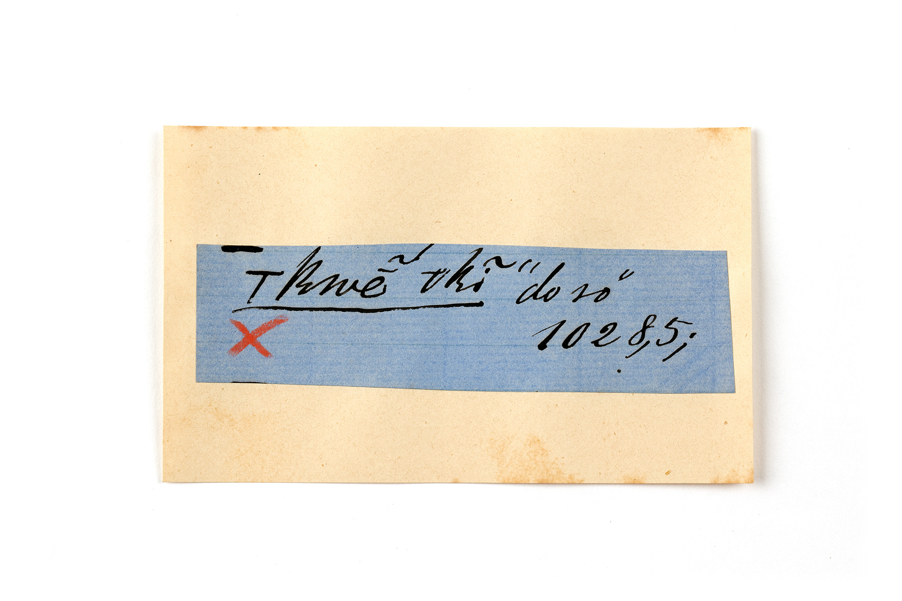 ink on blue paper glued on card