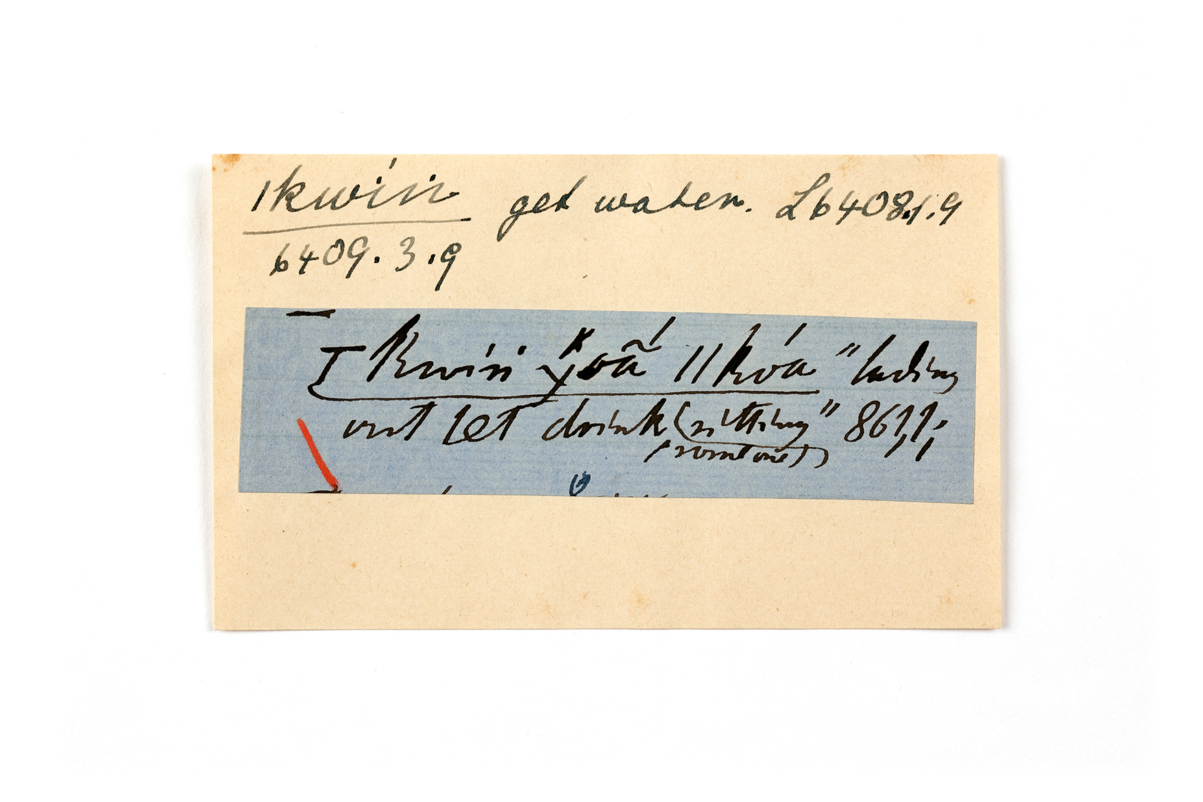 ink on blue paper glued on card