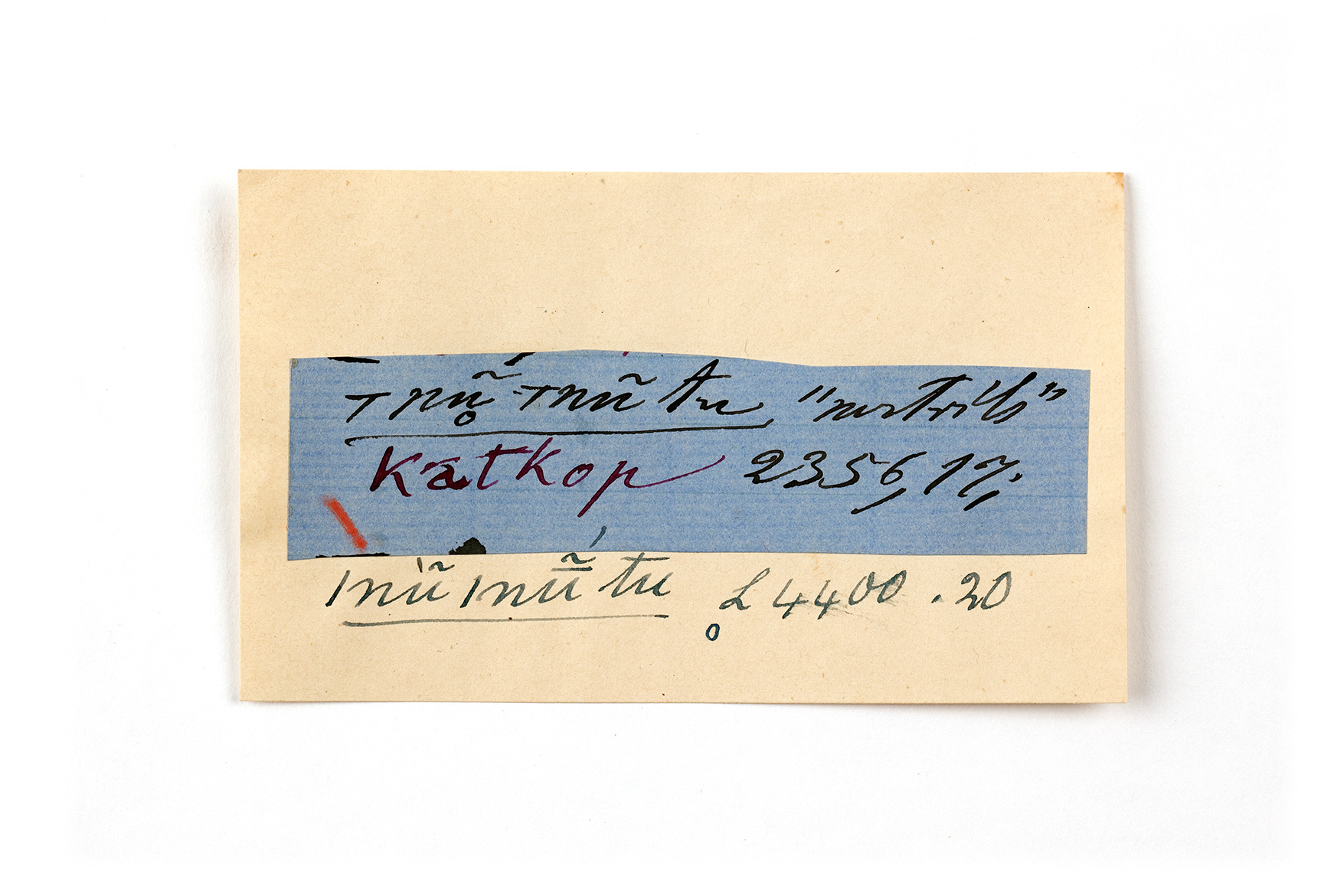 ink on blue paper glued on card