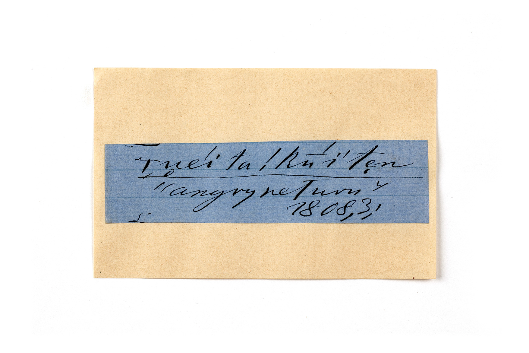 ink on blue paper glued on card