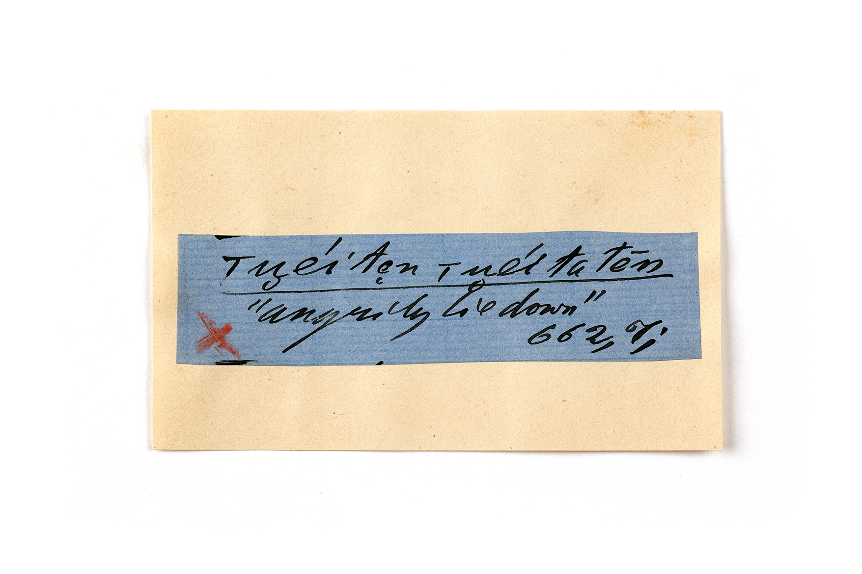 ink on blue paper glued on card
