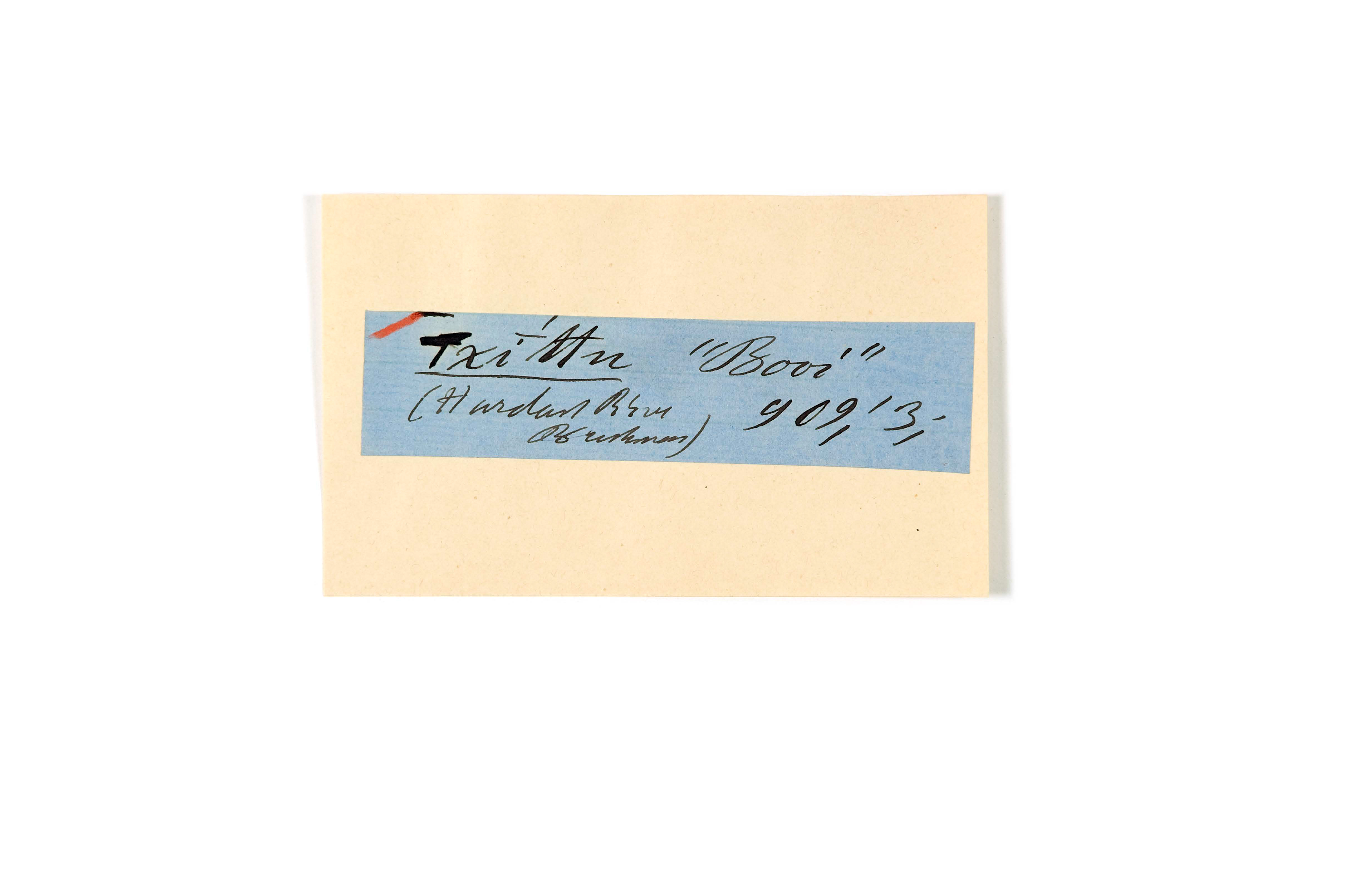 ink on blue paper glued on card