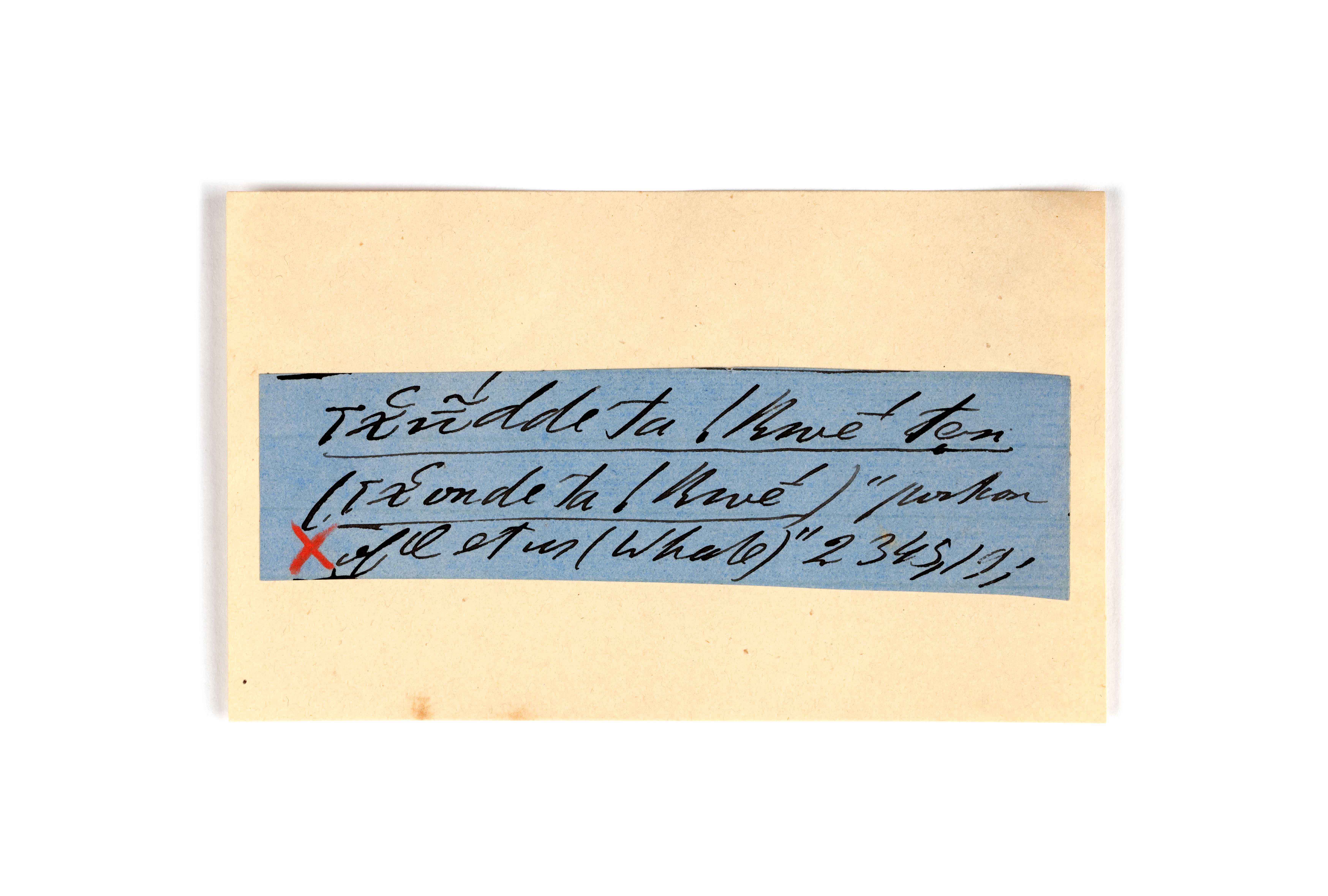 ink on blue paper glued on card