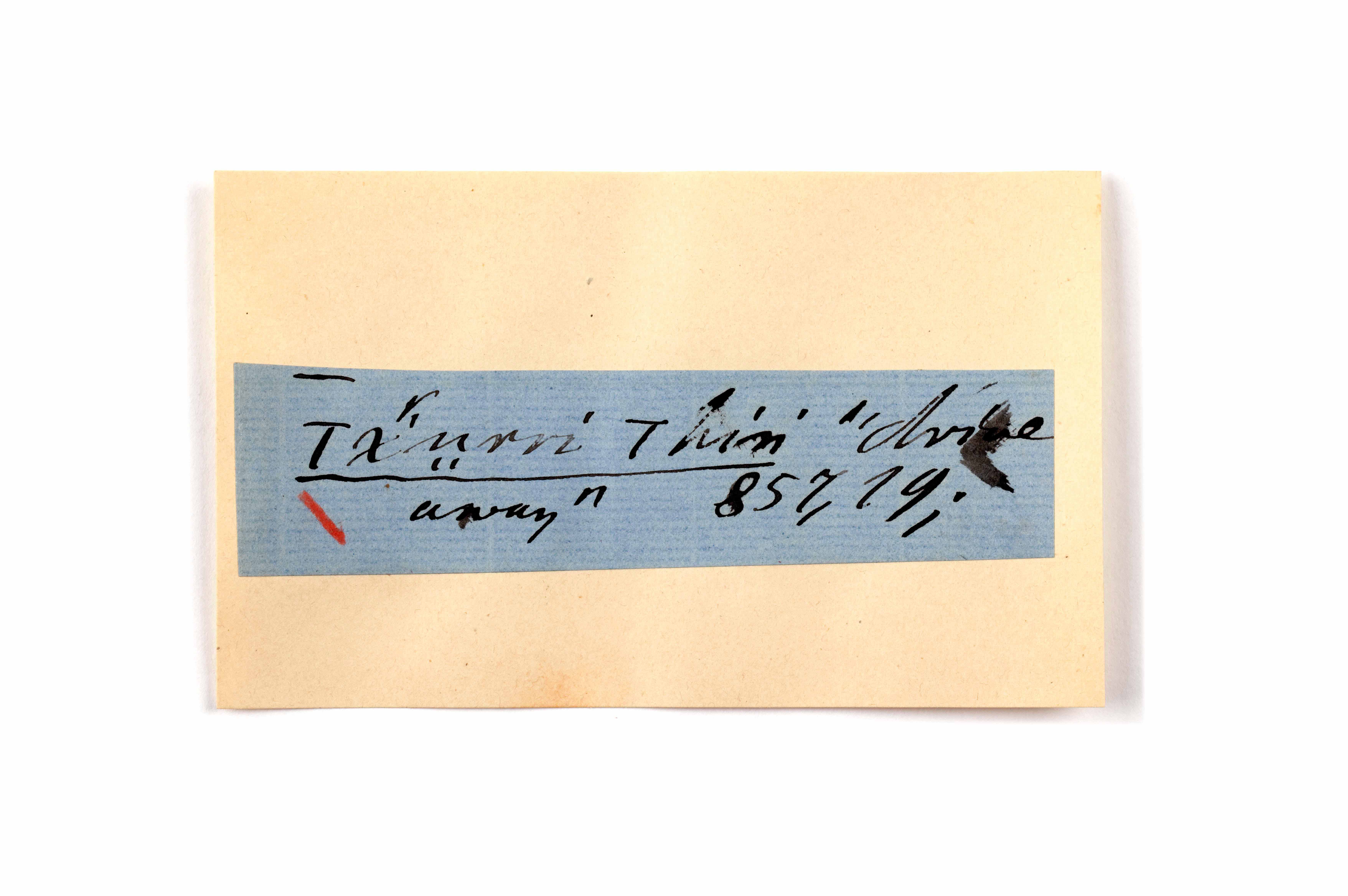 ink on blue paper glued on card