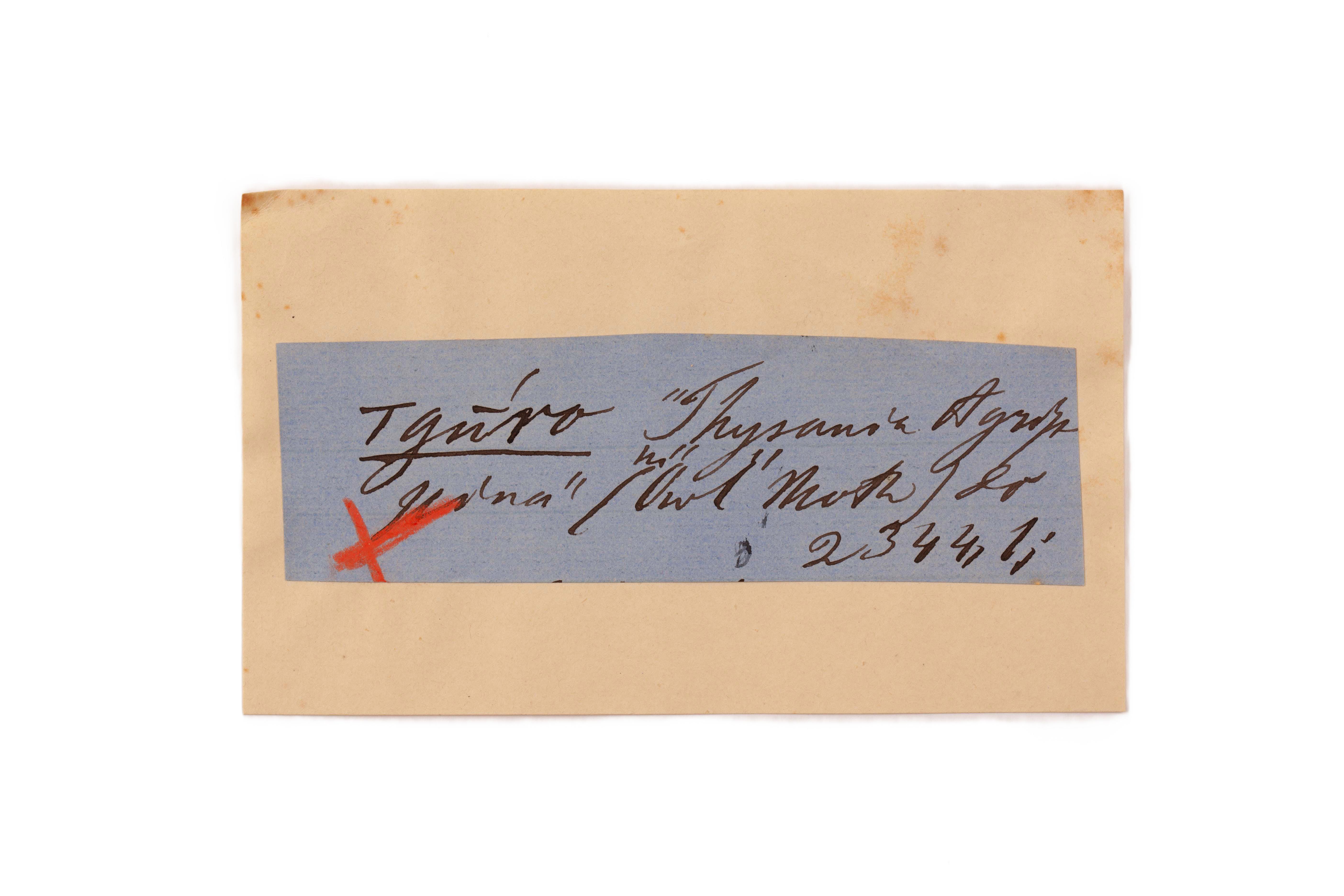 ink on blue paper glued on card