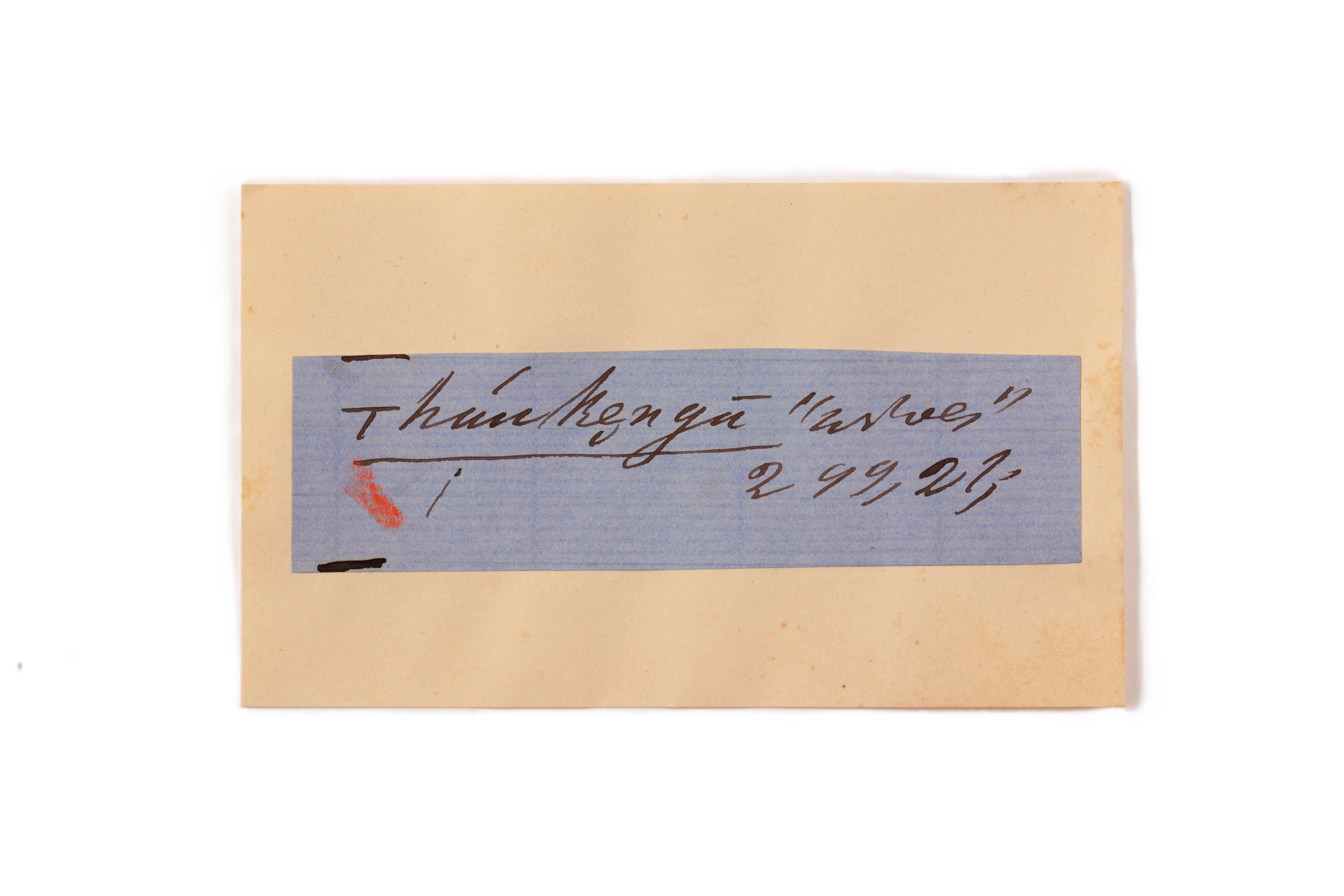 ink on blue paper glued on card