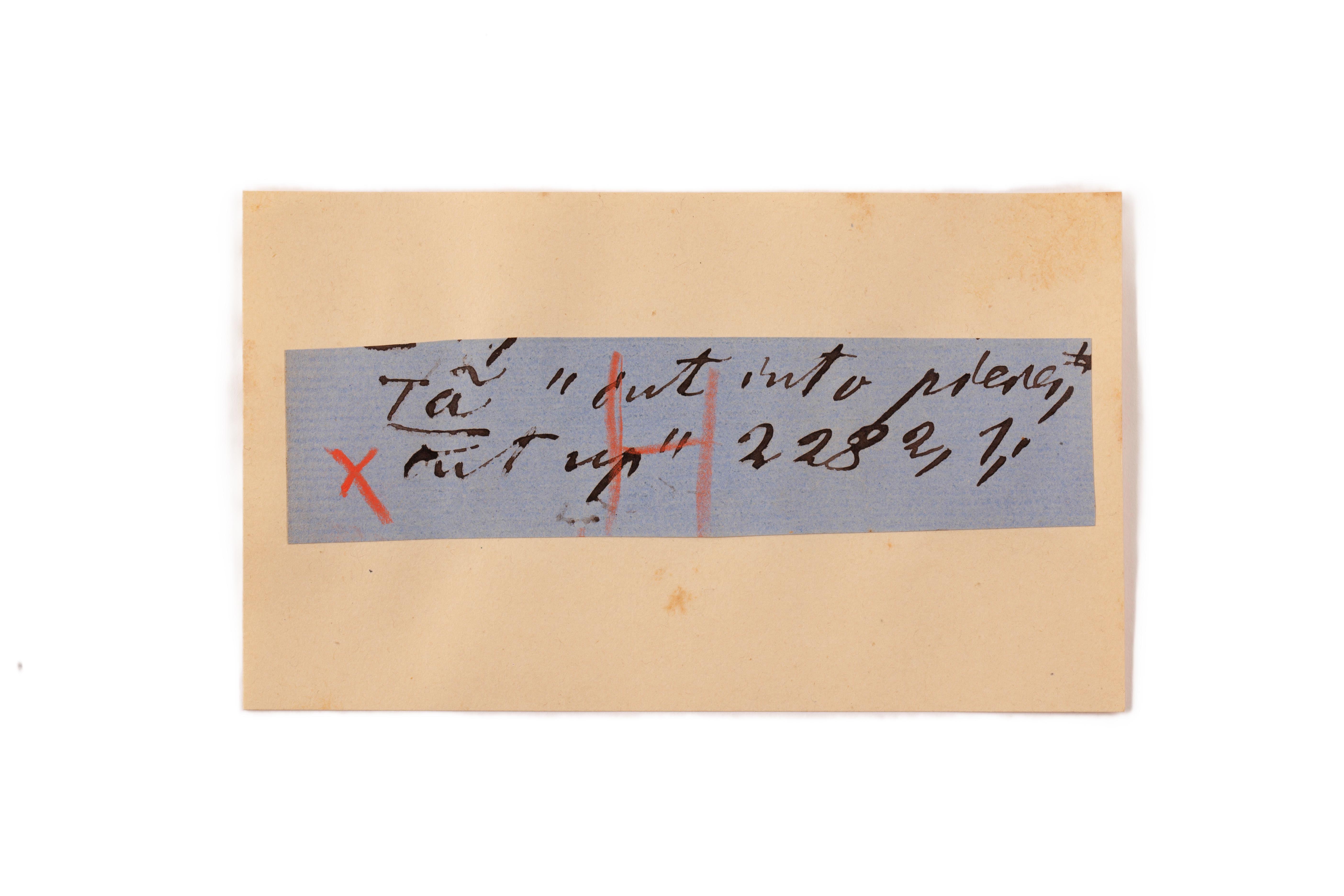 ink on blue paper glued on card