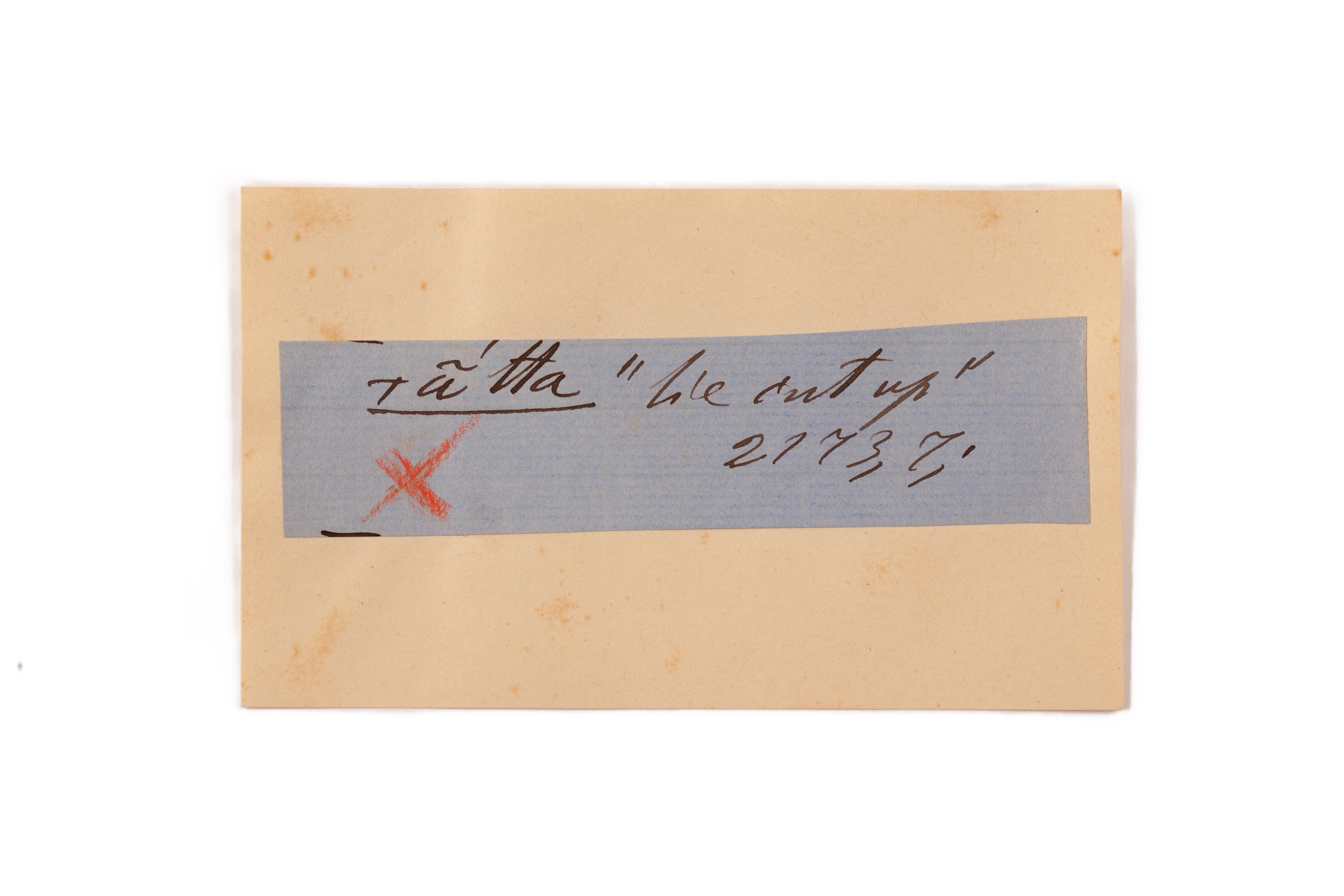 ink on blue paper glued on card