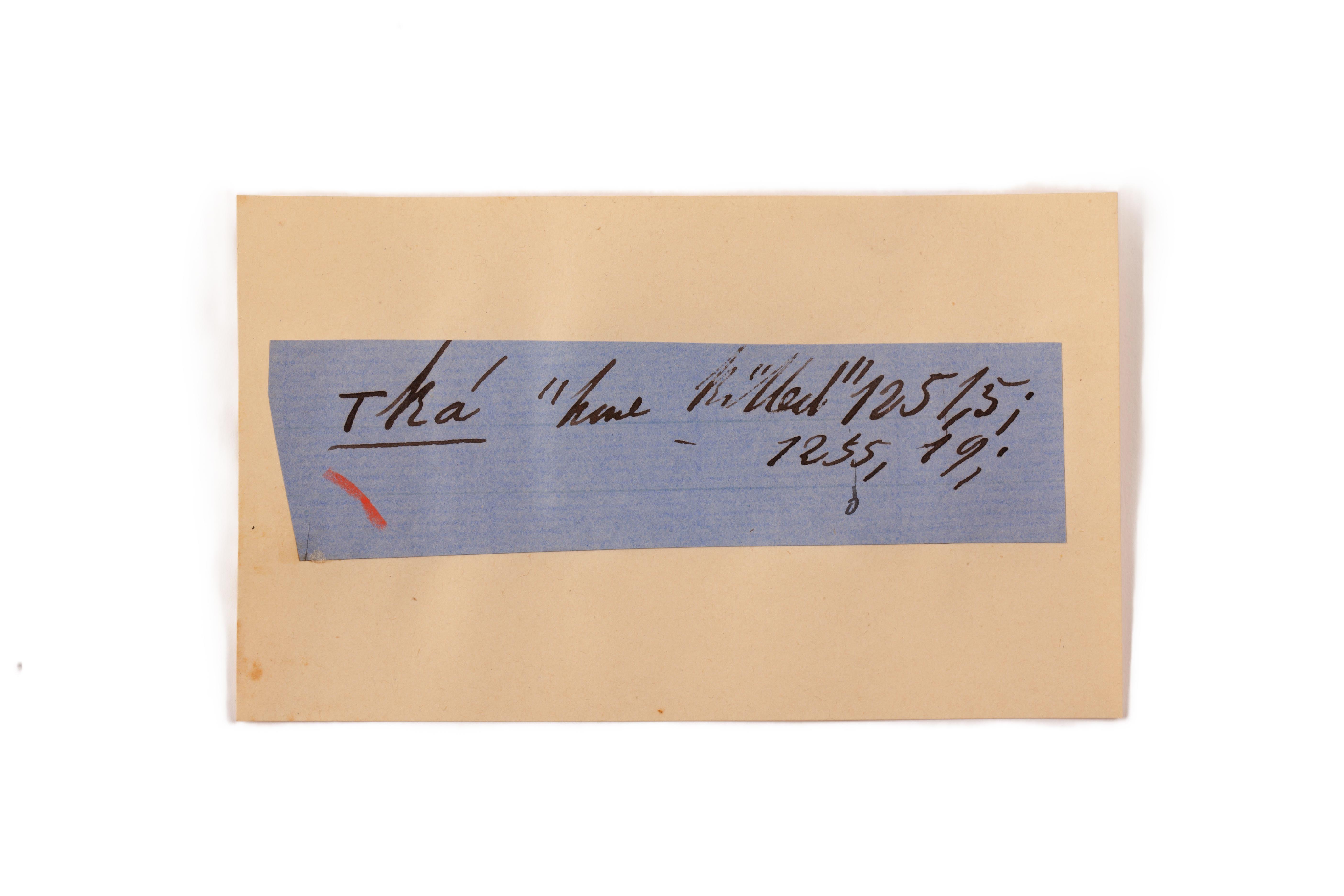 ink on blue paper glued on card