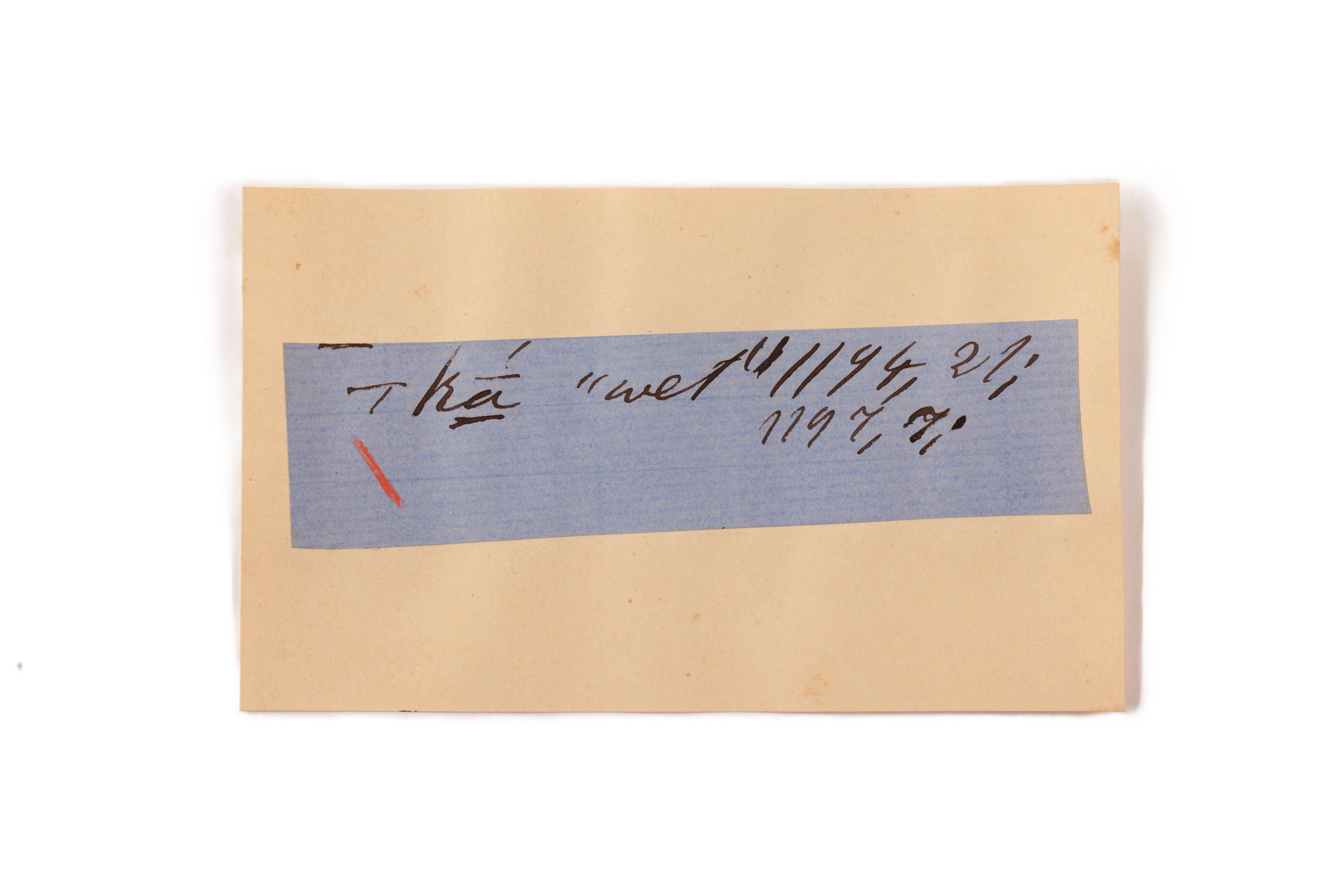 ink on blue paper glued on card