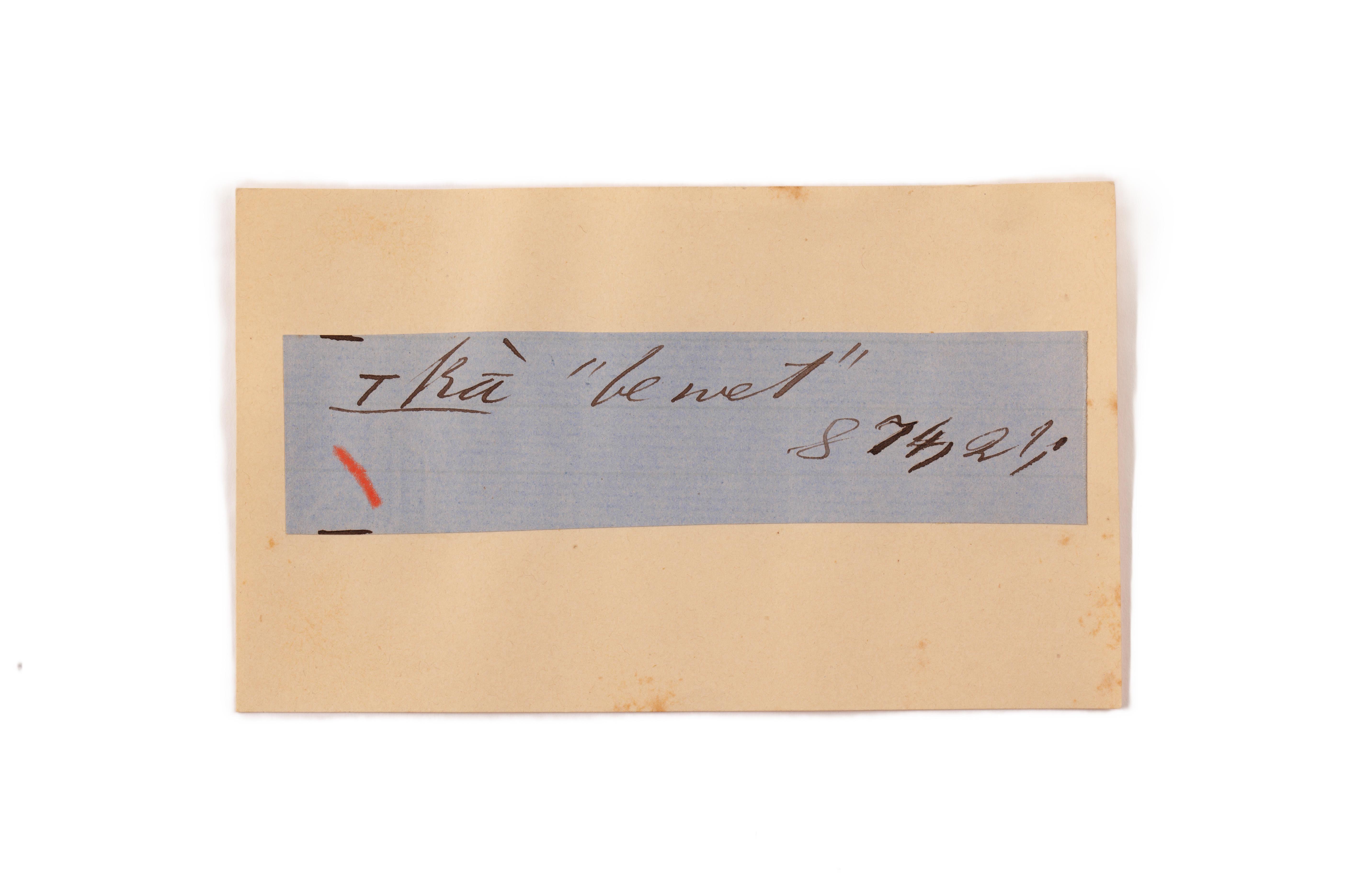 ink on blue paper glued on card
