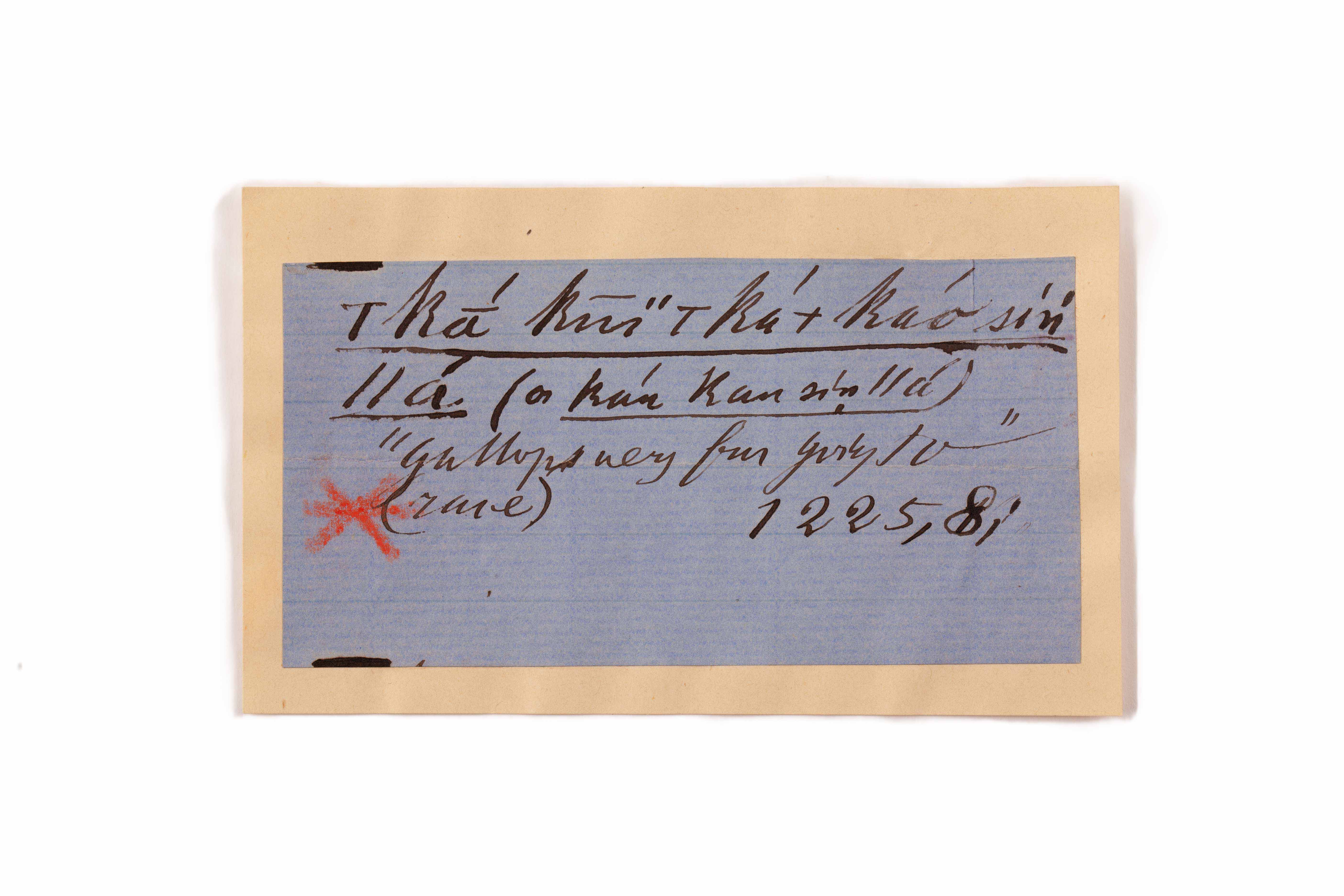 ink on blue paper glued on card