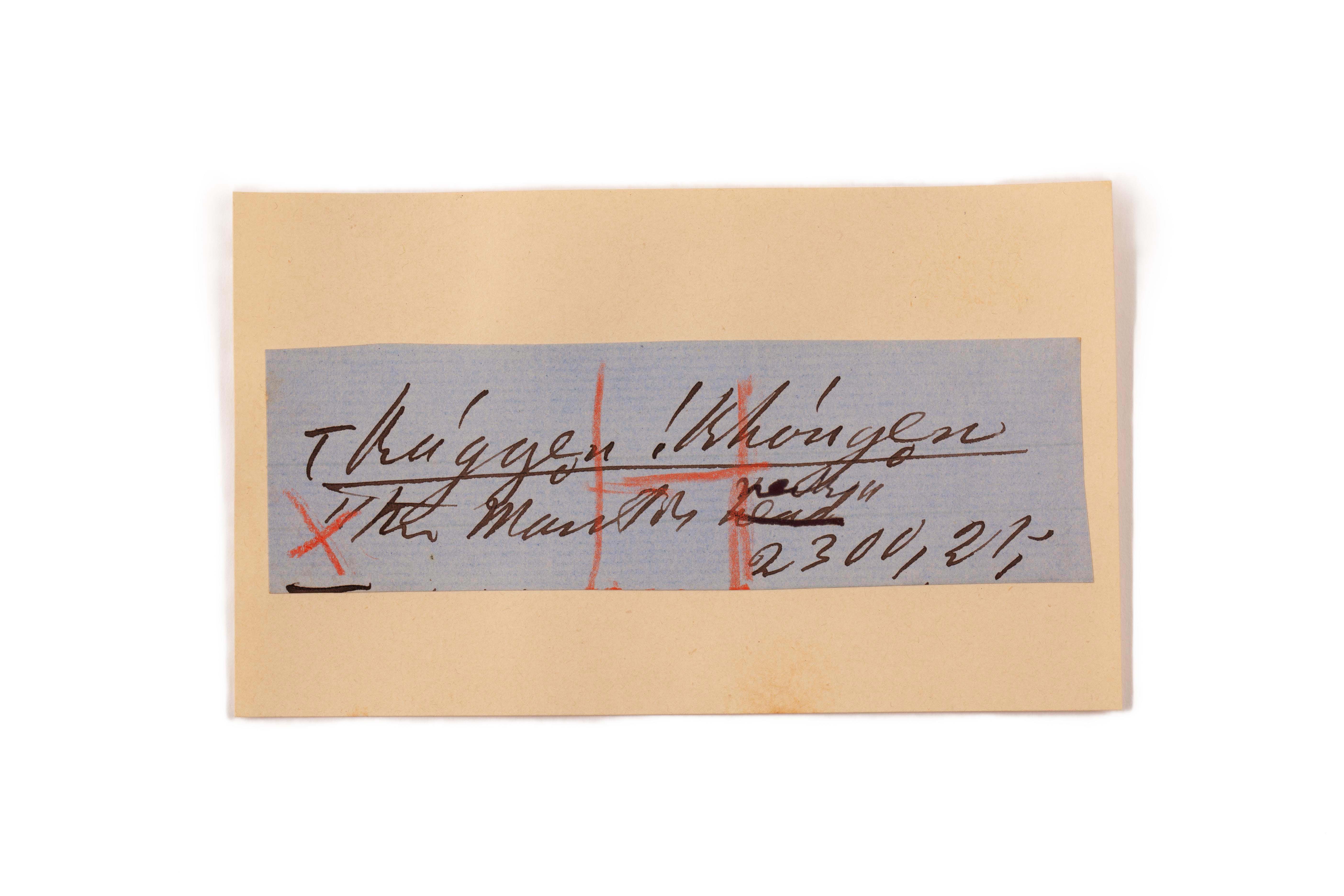ink on blue paper glued on card