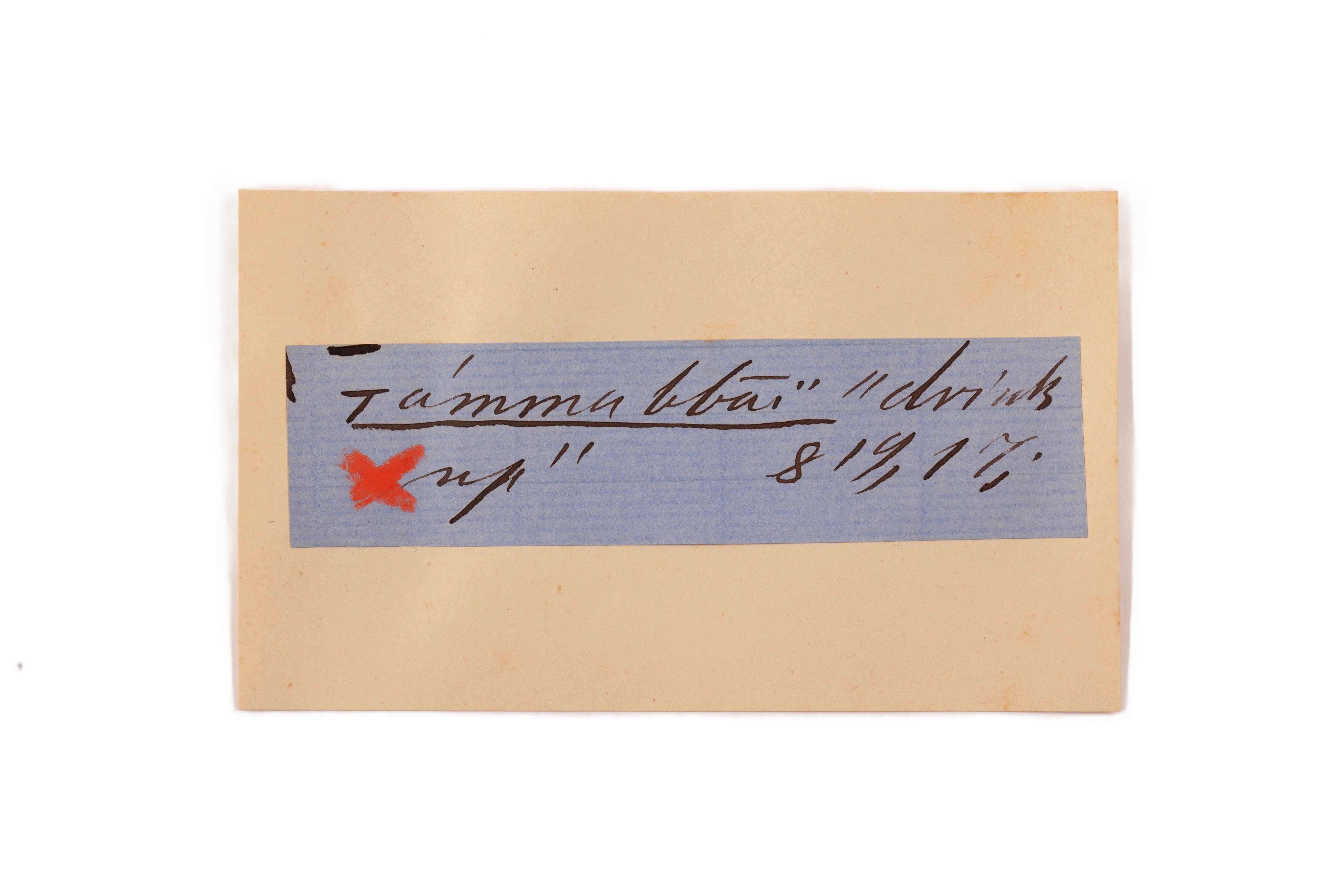 ink on blue paper glued on card