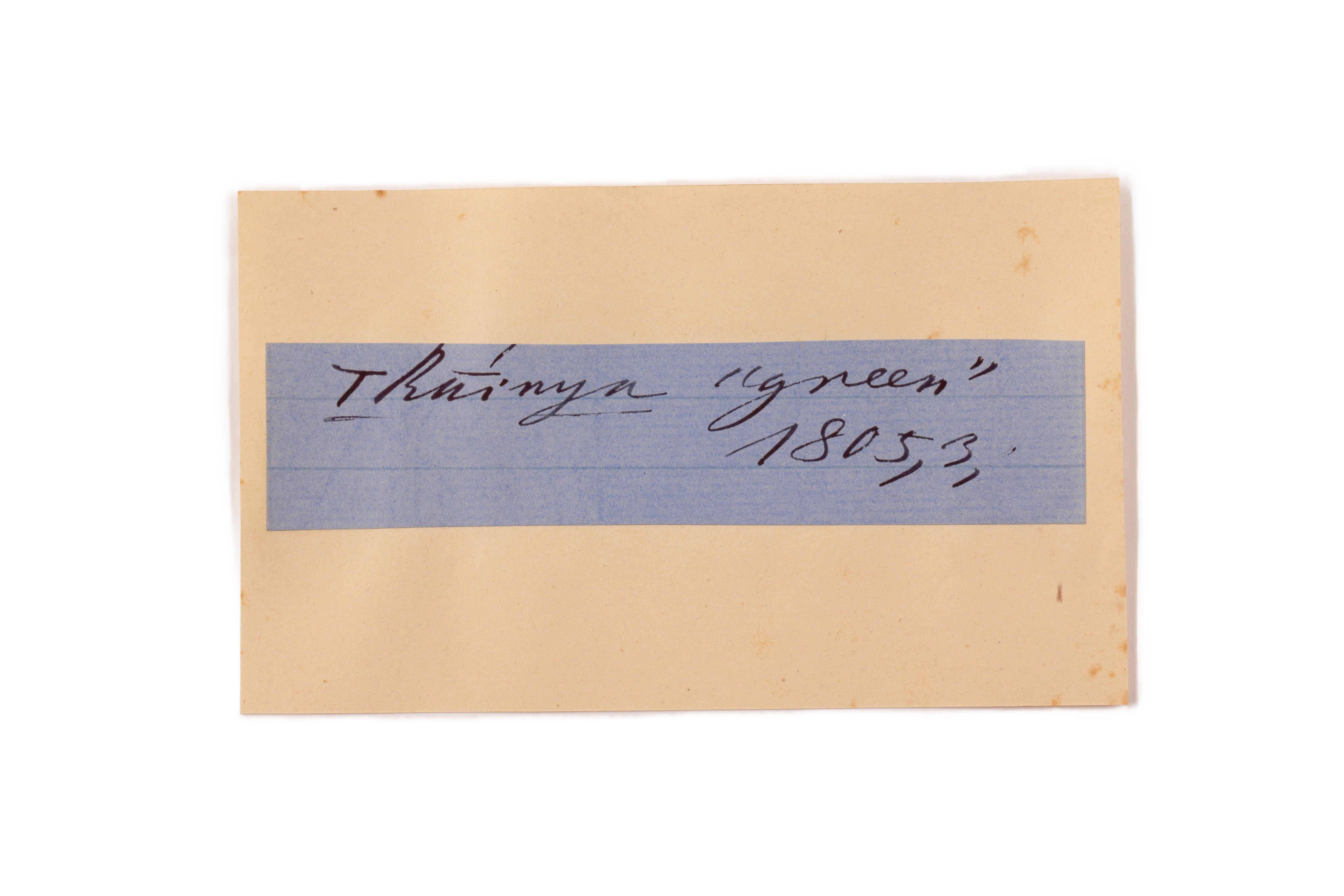 ink on blue paper glued on card
