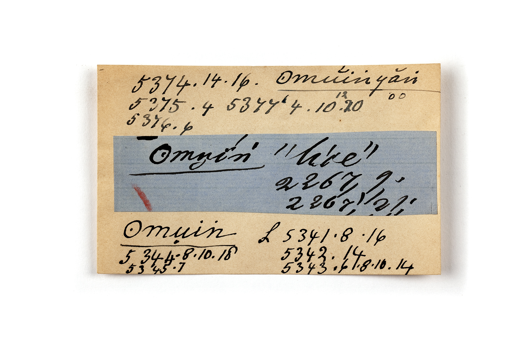 ink on blue paper glued on card