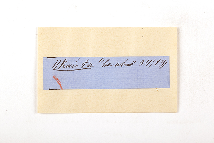 ink on blue paper glued on card