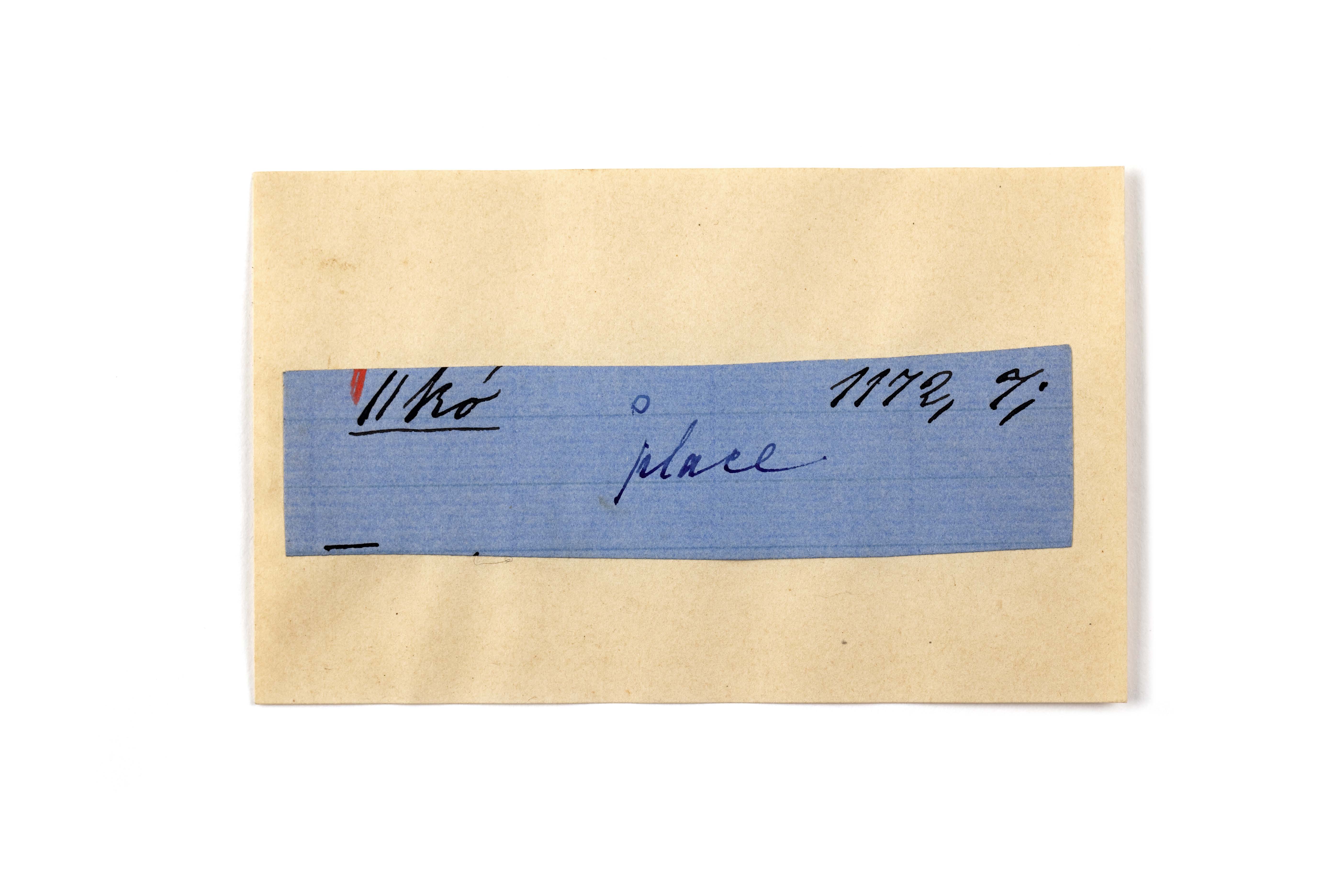 ink on blue paper glued on card