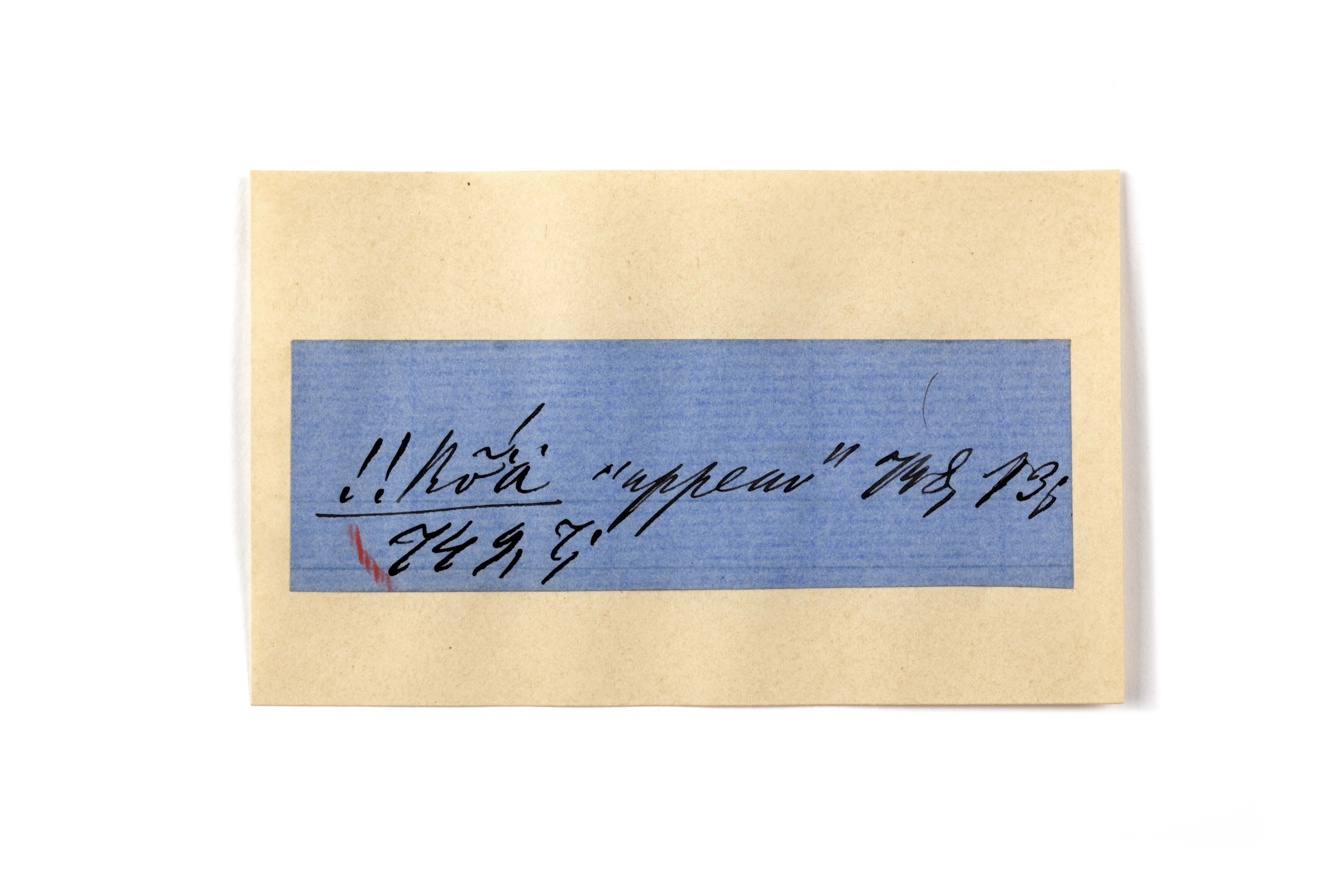 ink on blue paper glued on card