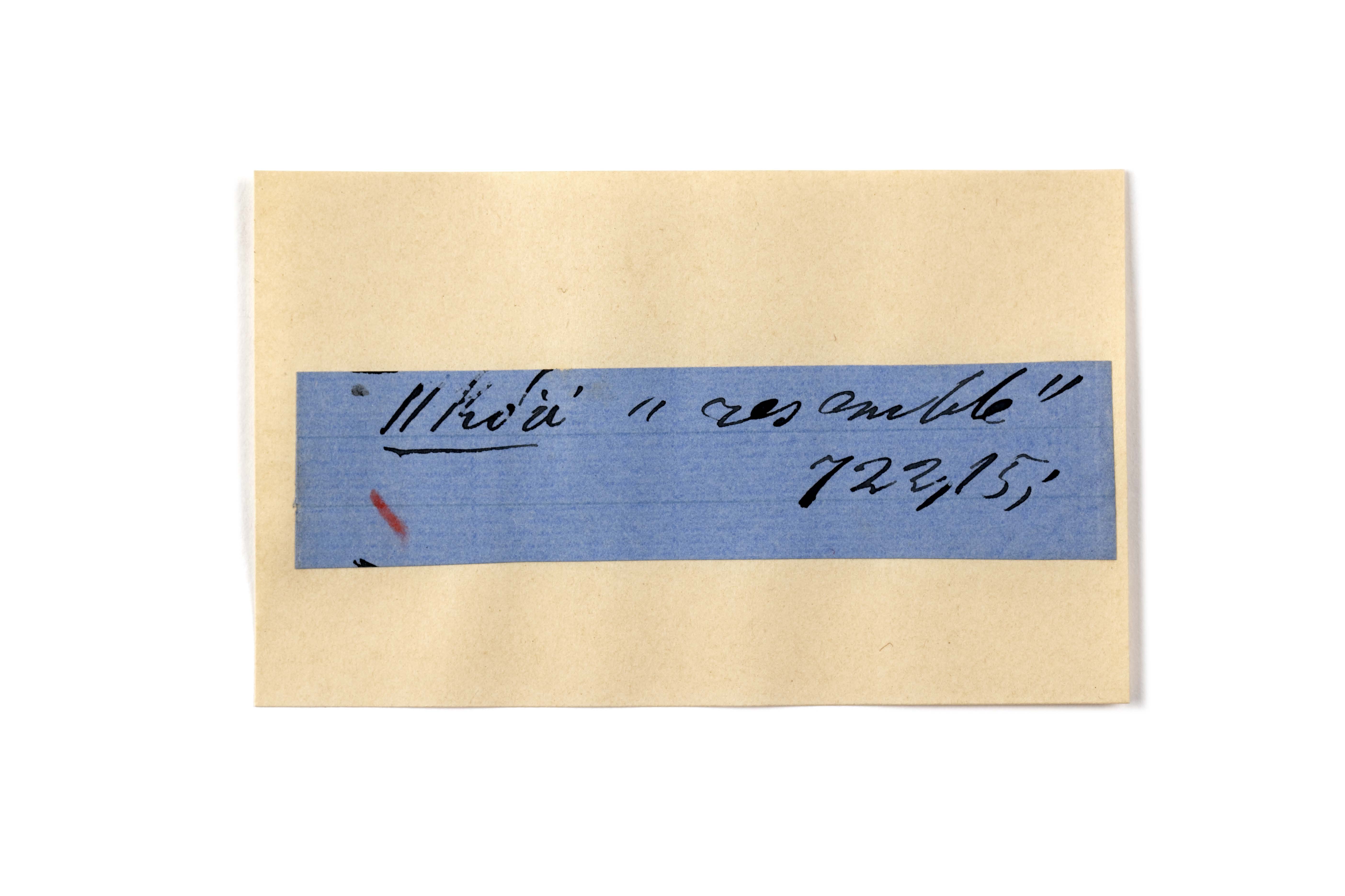 ink on blue paper glued on card
