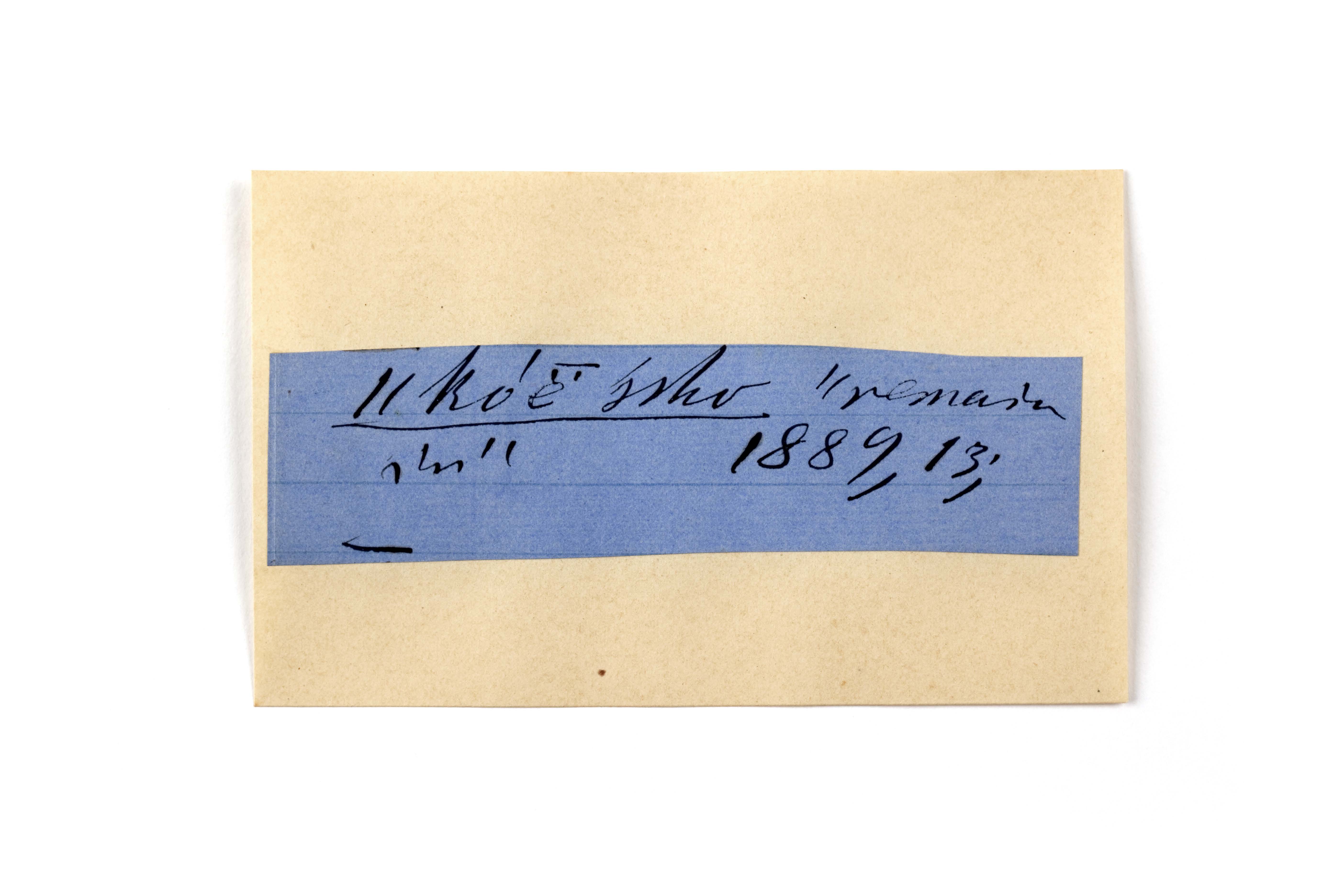 ink on blue paper glued on card