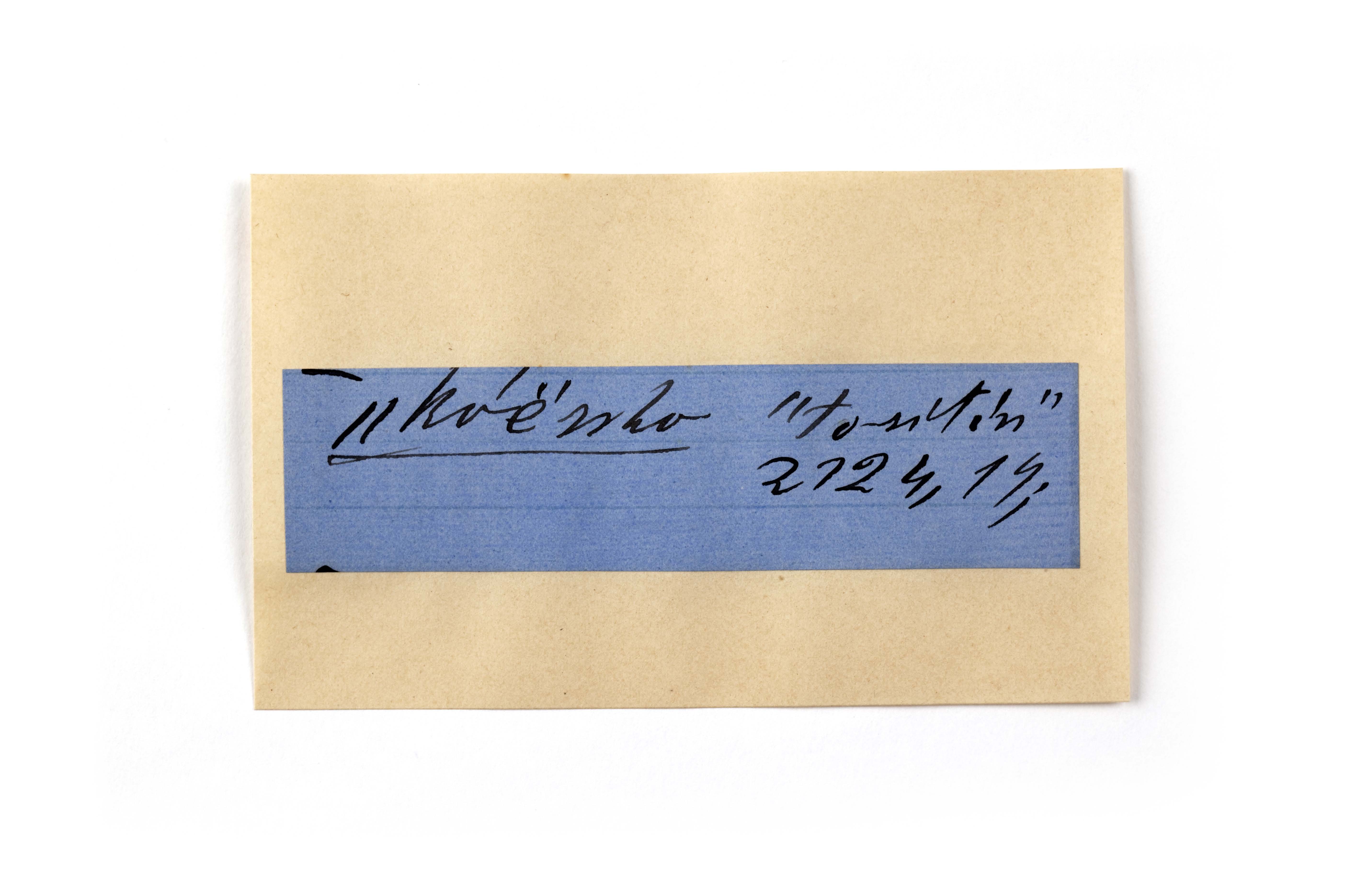 ink on blue paper glued on card