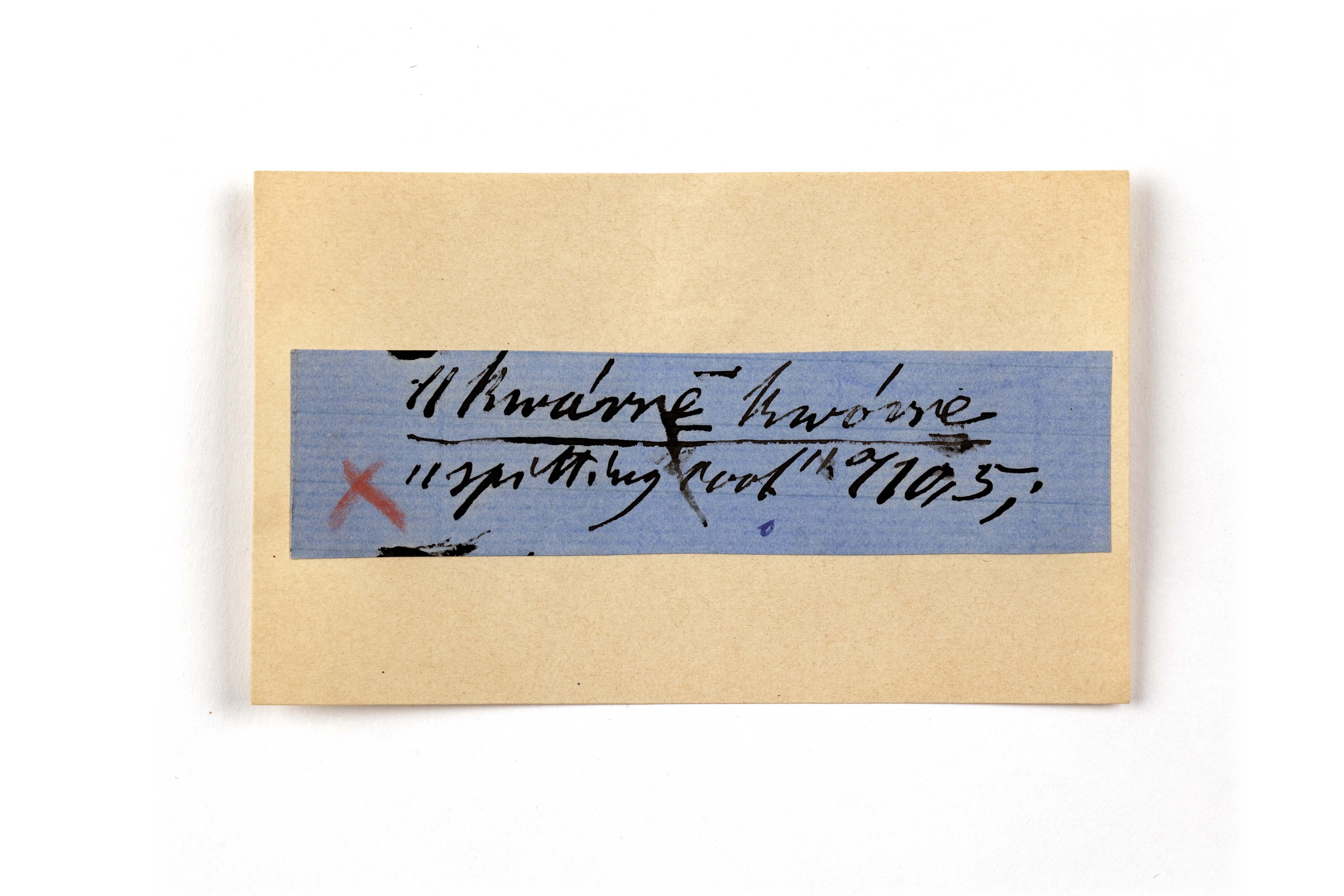 ink on blue paper glued on card