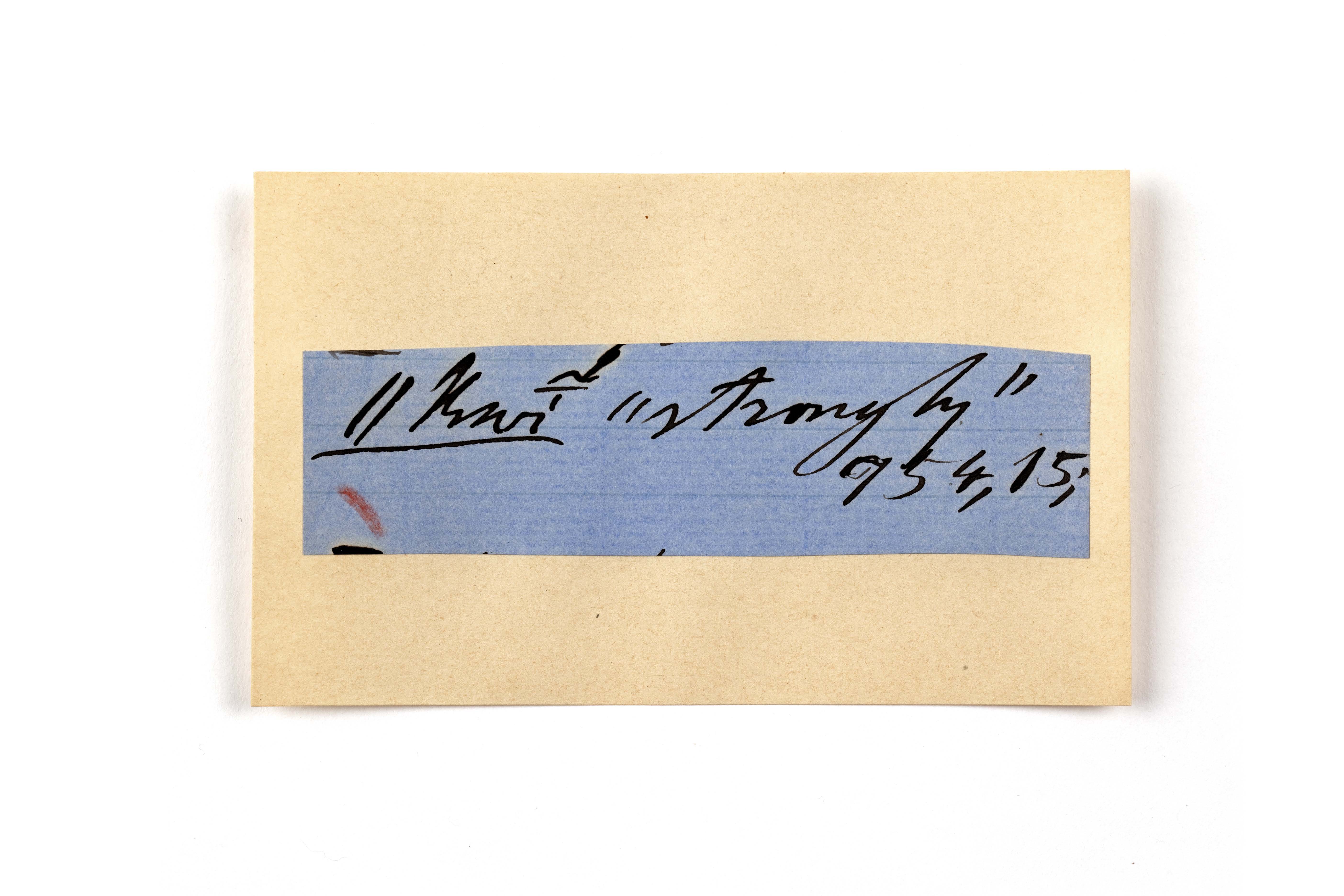 ink on blue paper glued on card