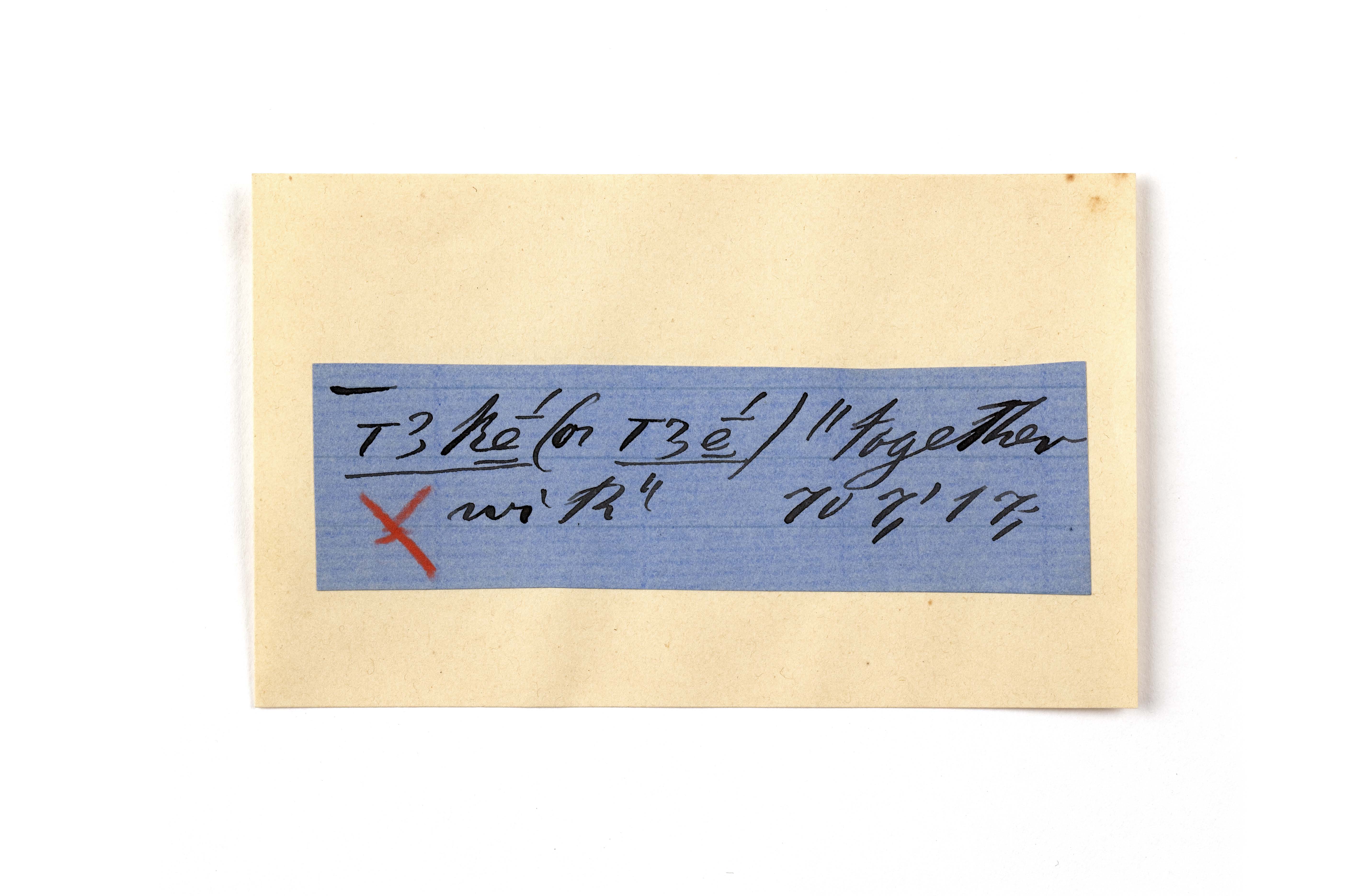 ink on blue paper glued on card