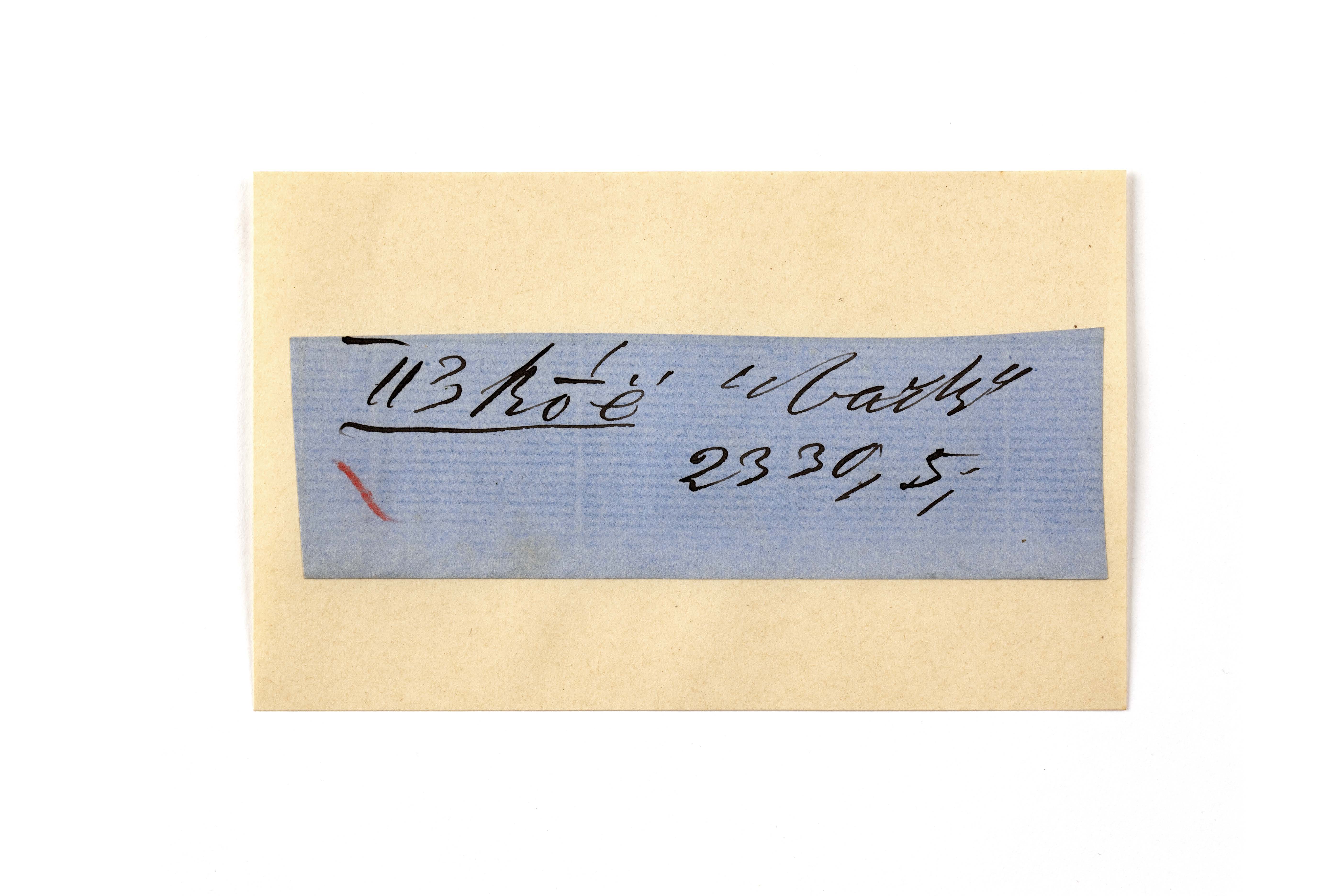 ink on blue paper glued on card