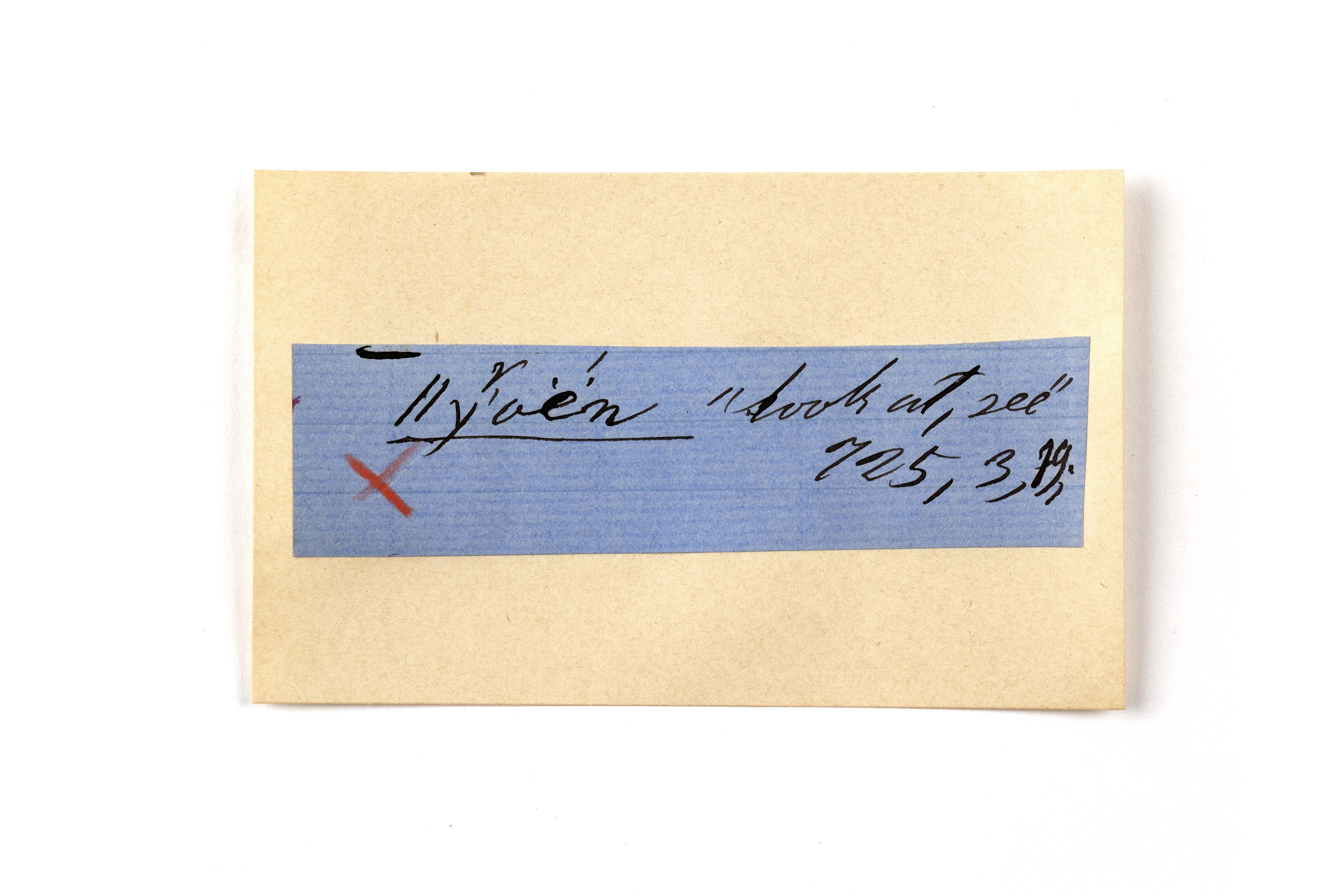ink on blue paper glued on card