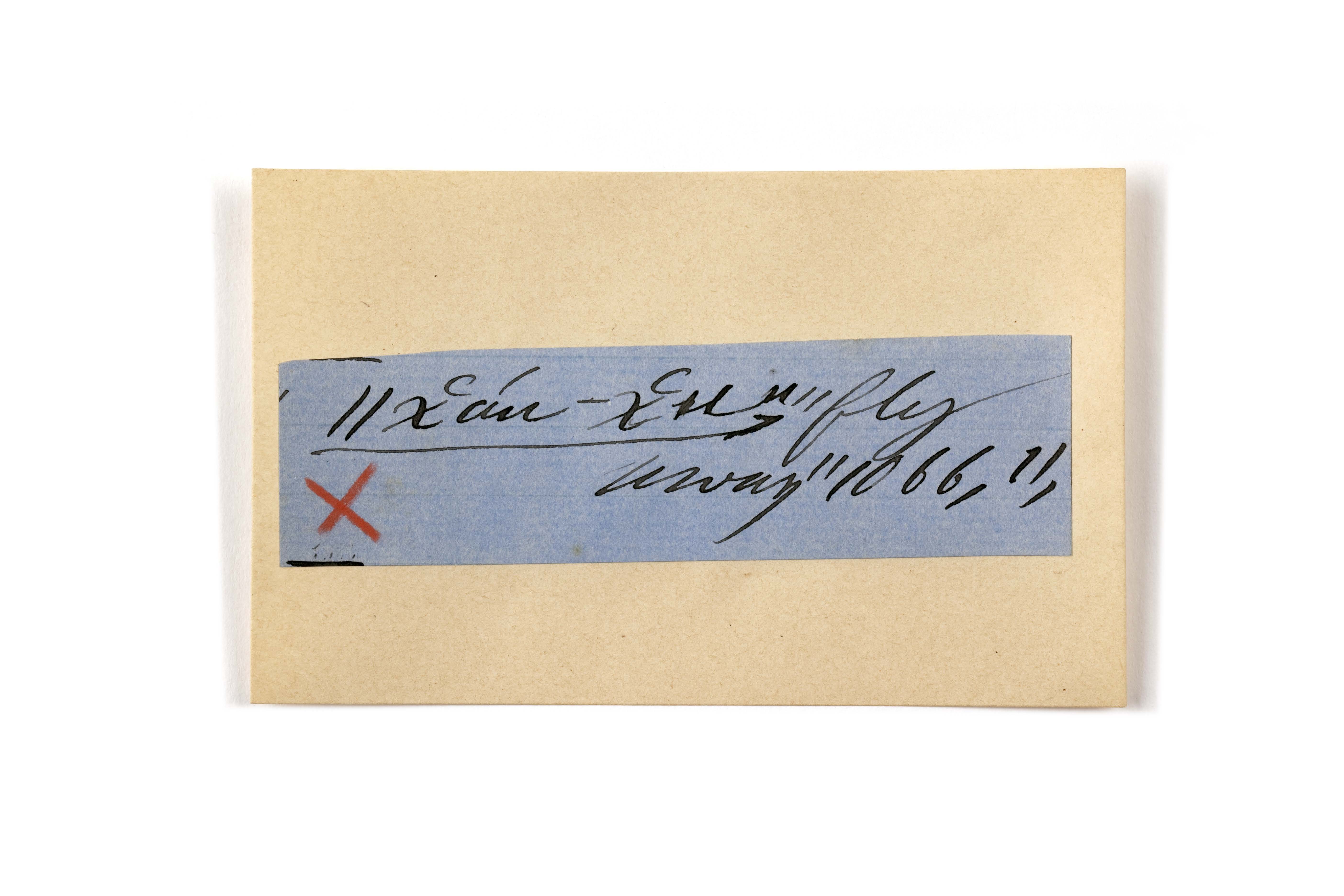 ink on blue paper glued on card