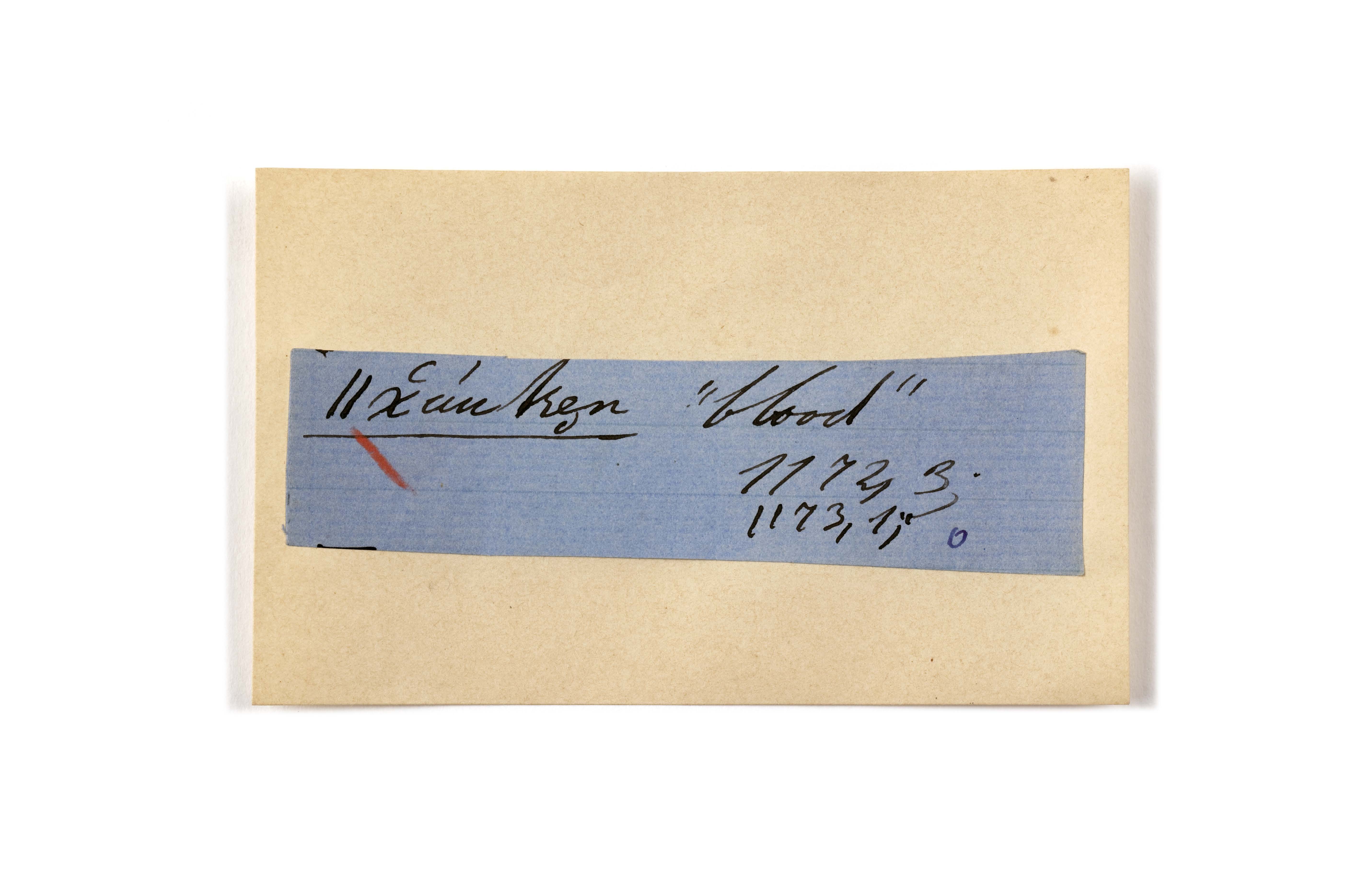 ink on blue paper glued on card