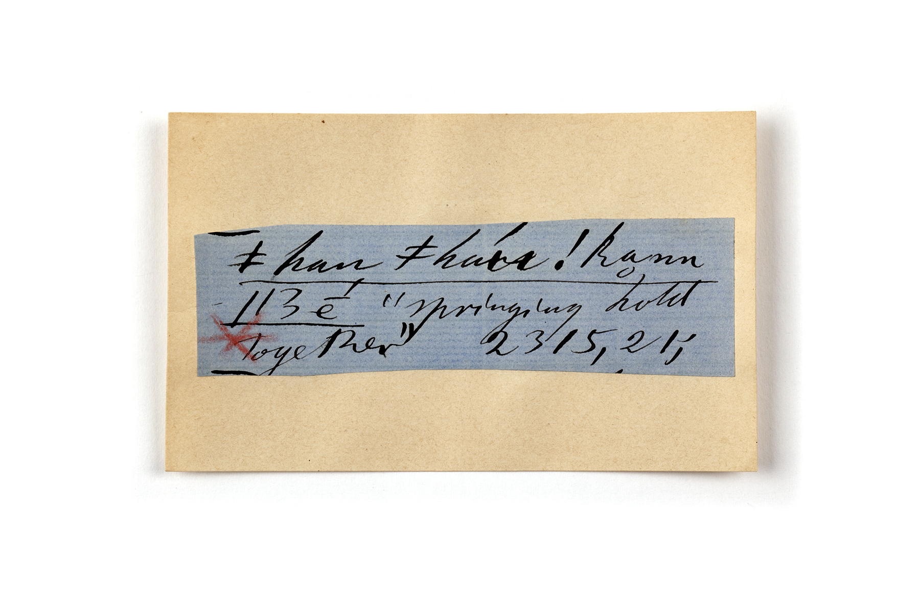 ink on blue paper glued on card